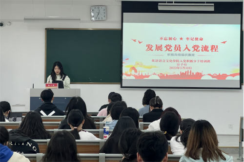5月10日,翻译系员工党支部书记徐子晗在融B307讲授“砥砺红色初心,争做最美青荷”专题党课。徐子晗向入党积极分子们系统地讲解了发展党员相关流程以及条件要求,加深了学员对党的基本理论和基础知识的理解,并就入党积极分子的培养考察提出了具体要求。