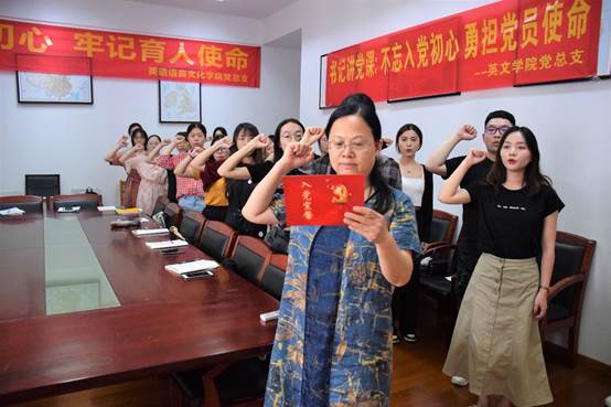 其后,员工党员在公司党总支负责人的带领下,在党旗下进行入党宣誓,大家以坚定有力的誓言,表达了入党的决心和理想,诠释了矢志不渝的追求和信念。教师党员也纷纷在微信群中,重温入党誓词,不忘入党初心。