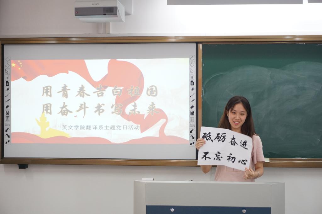 其后,翻译系员工党支部书记对本次活动进行总结,她讲到表达爱国的方式有很多种,无论是投身实践学习还是志愿参与活动,我们都应当拥护中国共产党的领导,爱国爱党。青年党员应心怀梦想,勇于追求,勤奋工作,通过点滴积累向着理想不断前进,这就是我们表达爱国主义情感的最切实的行动。大家纷纷表示,将不辱使命,勇于担当,用实际行动为新中国成立70周年献礼,用青春和汗水为中华民族伟大复兴做出自己的贡献!