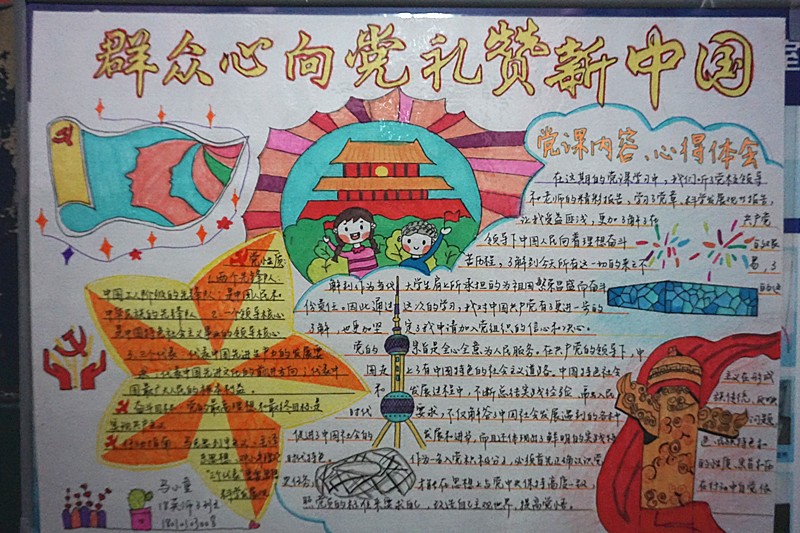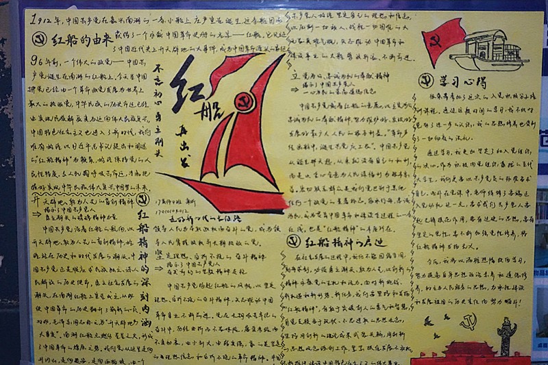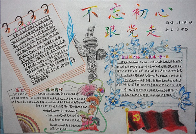 活动中,英文学子通过了解中国历史,将所思所悟所得绘制成手抄报的形式展出。色彩斑斓,排版清晰的手抄报中,凝聚的是同学们对“不忘初心”、“榜样力量”、“红船精神”等主题的认识与感悟,是对新时代国家政治的关注与思考,凸显着他们投身新时代建设的决心。