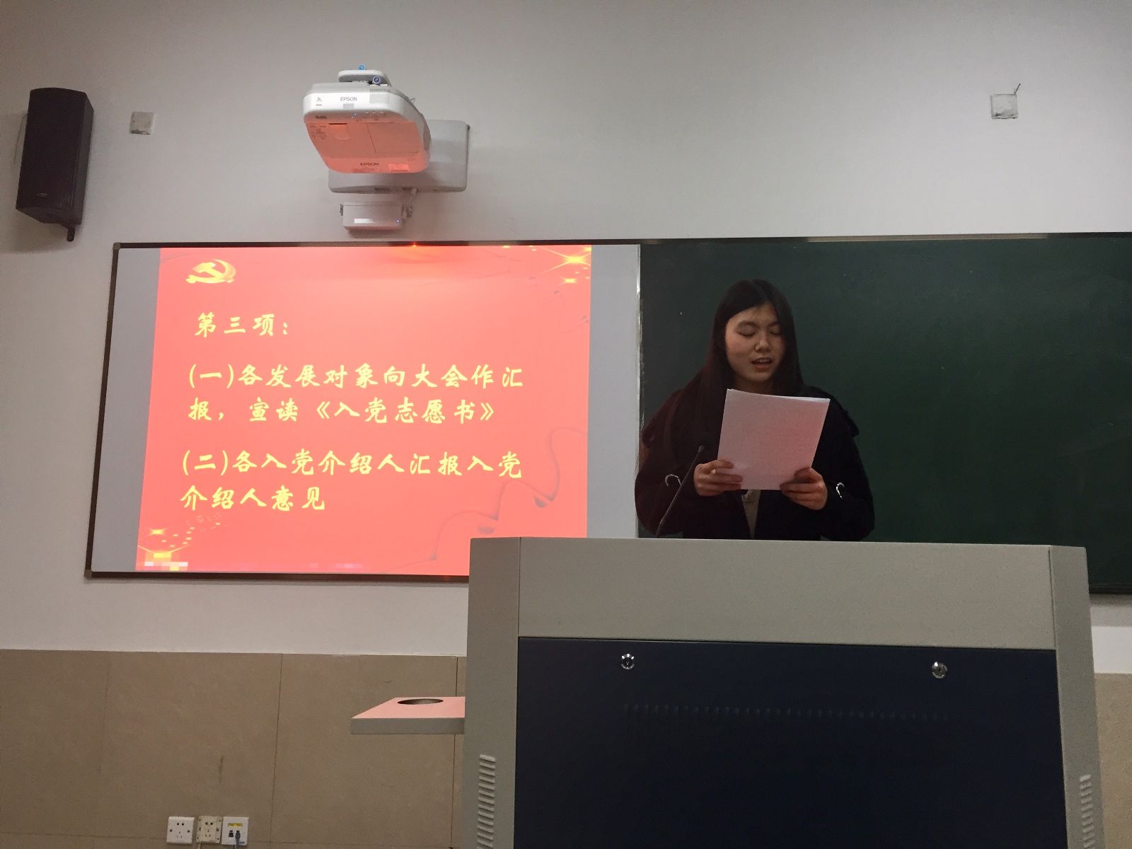 大会开始,发展对象依次上台宣读入党志愿书,严肃、真实地向党支部汇报了自己在提交入党申请书之后,工作、学习、生活上的进步,作风上的改进以及对党性党章的深刻理解,并对自己的不足之处进行了深刻的剖析。接着,入党介绍人向大家介绍了发展对象的相关情况,并对其能否入党进行意见表明。在支部书记发表有关发展对象审查情况的报告后,参加会议的党员们就此展开讨论,表扬了这些同学的优点,也对她们今后的学习、工作提出了宝贵的建议。经过到会党员投票表决,最终全体党员一致同意各发展对象正式成为中共预备党员。