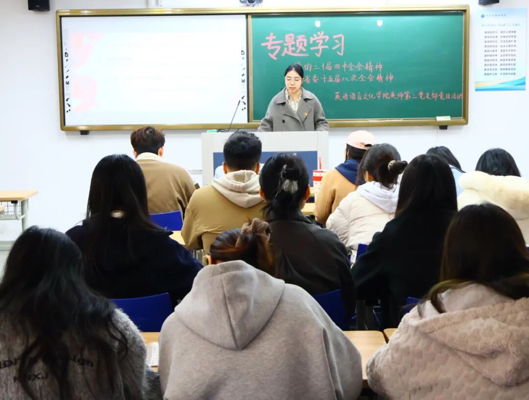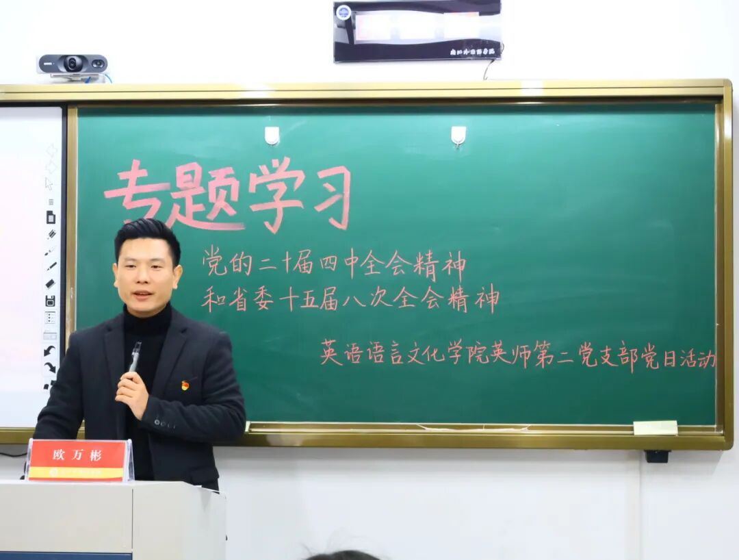 欧万彬围绕学习贯彻党的二十届四中全会和省委十五届八次全会精神作主题宣讲时强调,全体员工党员要深刻认识和把握全会的重大意义,自觉把自身发展放到中国式现代化建设全局和国家“十五五”发展大局中审视,深入思考新征程上“青年何为”这个关键问题。他希望全体员工党员不断夯实专业基础,练就过硬本领,努力提升跨文化教学与课程思政融合水平,打通多元发展赛道,以“先锋之姿”争当学业、就业方面的“头阵表率”。