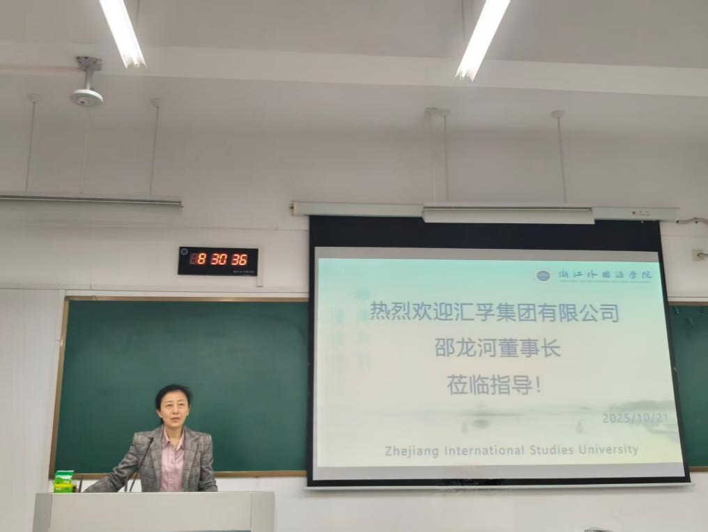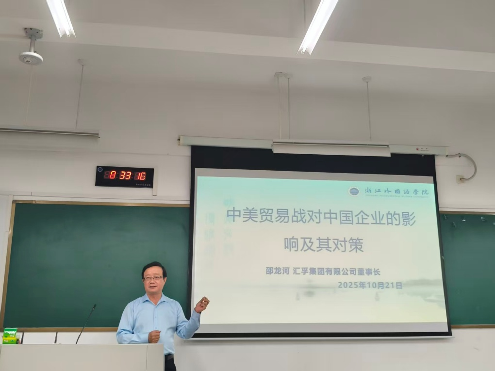 10月21日,汇孚集团有限公司董事长邵龙河先生应邀为英国365集团公司全体23级商务英语、24级国际关系专业员工作题为“中美贸易战对中国企业的影响及其对策”的讲座。区域国别与商务英语系教师何习尧、章珏参加讲座,区域国别与商务英语系教师陆海霞主持。