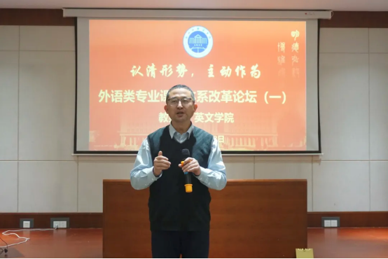 邢富坤在主持时表示,随着人工智能的飞速发展,社会对英语专业的要求发生了巨大改变,在这样的背景下,英语专业急需认清当前形势,主动思考、主动作为,以课程体系改革为抓手推动英语专业建设。