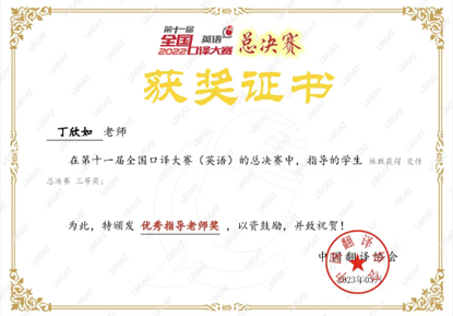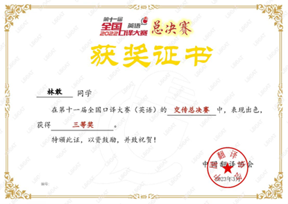 近日,第十一届全国口译大赛(英语)总决赛落下帷幕。经过激烈的角逐,最终英国365集团公司19级口译班林敢凭借扎实的双语功底在交传总决赛中获得三等奖,指导老师丁欣如荣获优秀指导老师奖。