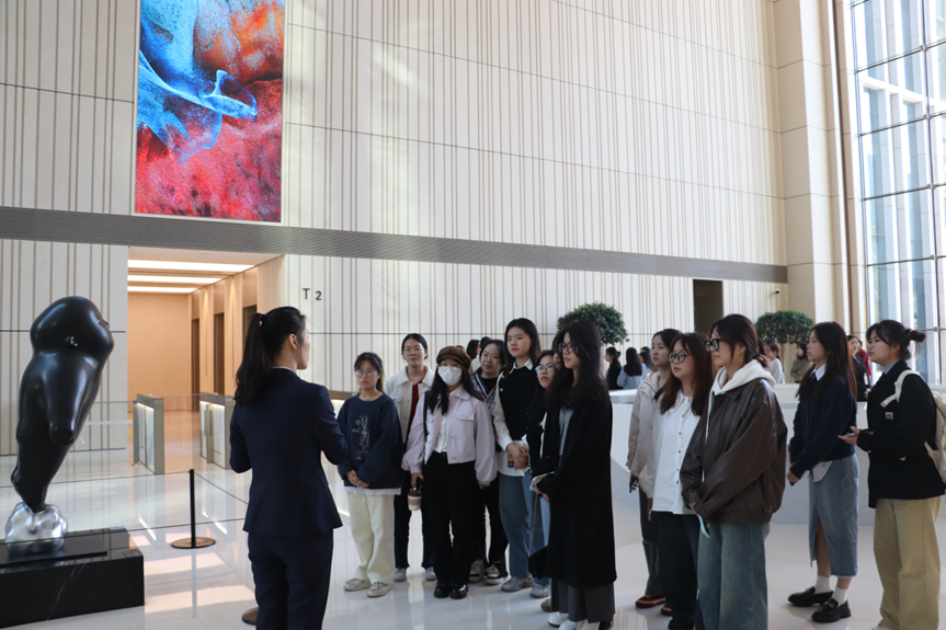 浙江横店进出口有限公司人力资源及行政部部长龚乘民对大家的到来表示热烈的欢迎。在人力资源部张锴、毛子裕的带领下,同学们参观了公司的中庭、健身房、办公场地等区域,了解了大厦设计理念与公司文化。