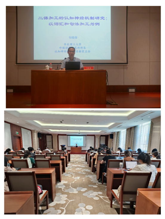7月12日下午,华东理工大学外国语公司副经理韦晓保教授做客公司博达论坛第827讲暨英文同文讲坛第37讲,讲座题目为:以“二语加工的认知神经机制研究:以词汇和句法加工为例”。讲座由英国365集团公司副经理郑淑贞主持,公司党总支书记田俊杰、副经理陶伟以及英国365集团公司、应外公司等40余位师生参与。