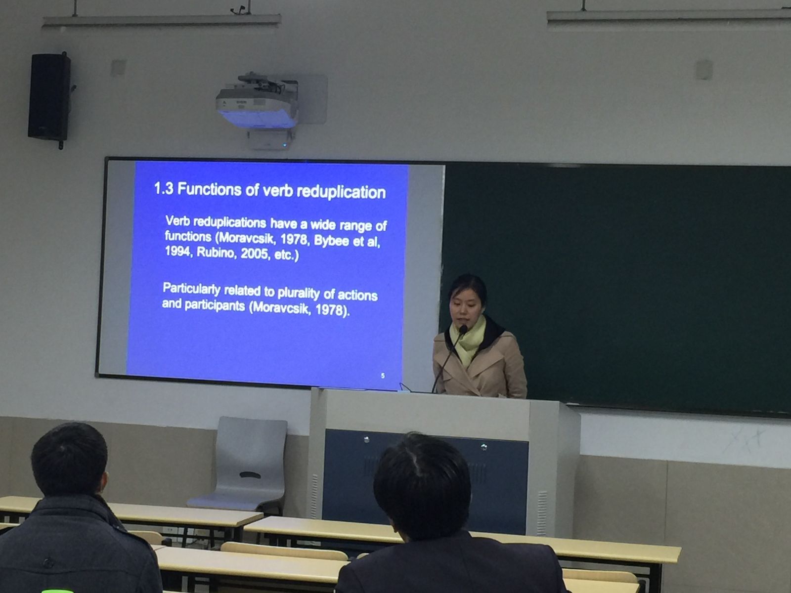 李悦园博士报告的题目为Mapping the functions of verb reduplication(动词重叠的语义地图),是她博士论文的一部分。她的研究先基于Bybee et al (1994)的动词重叠功能的语义图式,该图式的建立基于16种语言,涉及7种动词重叠功能。李博士的研究,修改并扩充Bybee之前的语义图式。新语义图式不仅覆盖动词重叠的体貌功能,也将涉及体貌范畴外的其他功能。在动词重叠的各种功能中,文献中一般认为反复是动词重叠的初始功能之一,原因在于动词重叠表达反复义时具有极高像似性。李博士的新研究,采用了更大样本中重新审视这一论断。采集113种不同语言,对这些语言中的动词重叠的功能和形式统一标注。统计结果显示,动词重叠在样本中可表示多达45种不同功能。其次,测量了不同功能间的语义近似程度。该测量基于构式的多义现象,并参考了不同多义构式的出现频率。李博士新语义图式不仅全面而且更科学合理,对语言类型学研究有很参考价值。