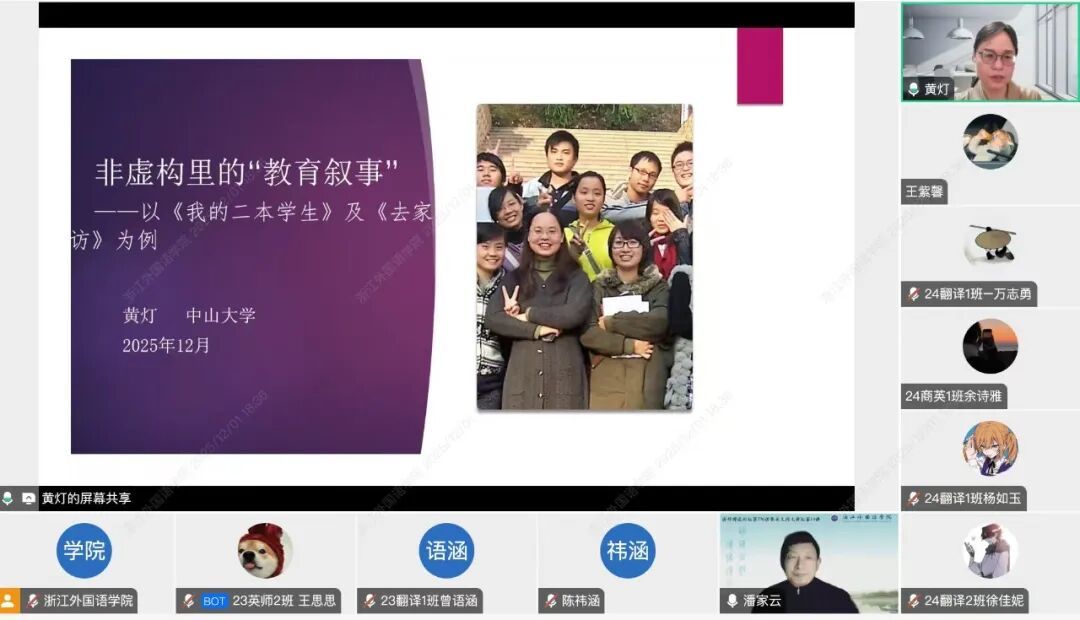 近日,浙外博达论坛第1097讲暨英文同文讲坛第136讲顺利举行。中山大学中文系黄灯教授应邀作题为“非虚构里的‘教育叙事’:以《我的二本员工》《去家访》为例”的专题讲座,逾百名师生参加,英国365集团公司文学与创作系学科专业负责人潘家云教授主持。