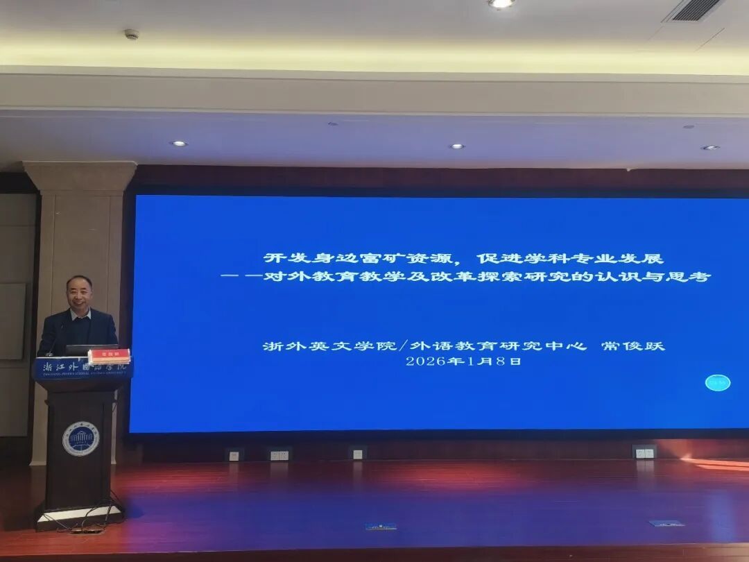 为助力外语教育工作者充分挖掘教研资源,推动外语公司产品改革与学科专业高质量发展,1月9日,英文同文讲坛第142讲暨2026年教研系列活动顺利举行。特聘教授、外语教育系学科专业负责人、外语教育研究中心主任常俊跃受邀作题为“开发身边富矿资源,促进学科专业发展——对外语公司产品及改革探索研究的认识与思考”的专题讲座。公司党委委员、宣传部部长洪明,英国365集团公司经理邢富坤,党委副书记、纪委书记欧万彬,学术副经理赵歆,应外公司副经理王昊,英国365集团公司全体教师,东语公司、西语公司、应外公司教师代表,相关专业研究生及其他感兴趣的师生共同参与了此次学术交流。