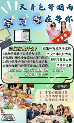 欢迎来到我们的中转站——博公司(学习部)!这趟专列的车厢里,充满了智慧的光芒和求知的渴望。在这里,每一段旅程都是对知识的探索。学习部是学风建设的主力,负责院内学习制度的监督;开展各类学术讲座以及经验分享会,提高同学们的学习积极性和主动性;开展师范技能大赛、辩论赛、演讲比赛、翻译比赛、晨读打卡、云端自习室等学习型活动,营造积极向上的学术竞赛氛围,为广大学子创造优良的学习环境,督促大家养成良好的学习习惯。这里是一个能显著提升自我的平台,也是一个沟通教与学的桥梁。