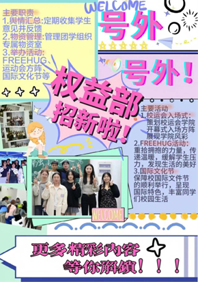 权益部作为物资室管理部门,负责管理团学组织的所有物资,同时也协助其他部门举办活动,提供必要的物资支持和后勤保障服务。除此之外,权益部还承担着重要的舆情收集和汇报工作。我们会密切关注员工群体的意见和反馈,及时反馈给公司领导和相关部门,为员工争取更多的权益和福利。部门也以员工为出发点举办过多项活动,致力于为全体师生服务。