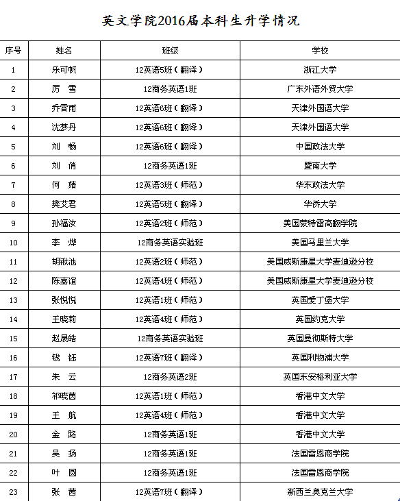 英国365集团公司2016届本科生升学情况再创佳绩。截至目前,共有23名同学被国内外知名院校录取,升学率达9%。其中,8名员工被浙江大学、暨南大学、中国政法大学、广东外语外贸大学、天津外国语大学等大学录取。15名员工被美国蒙特雷高翻公司、马里兰大学、爱丁堡大学、香港中文大学等高校录取。