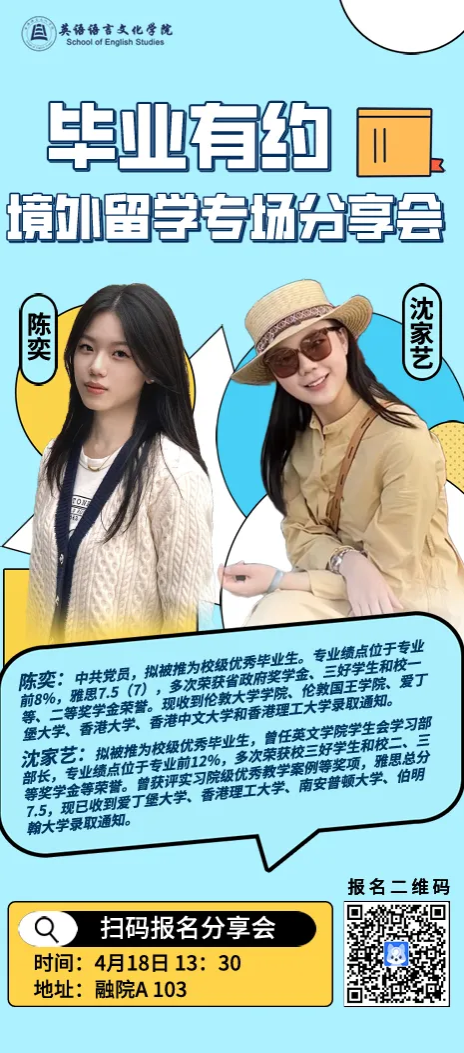 为了帮助大家更全面地了解境外留学相关信息,“毕业有约”系列活动第二期——境外升学专场如期而至。公司邀请了两位斩获多份境外高校offer的学姐为大家解答申请院校过程中的疑难困