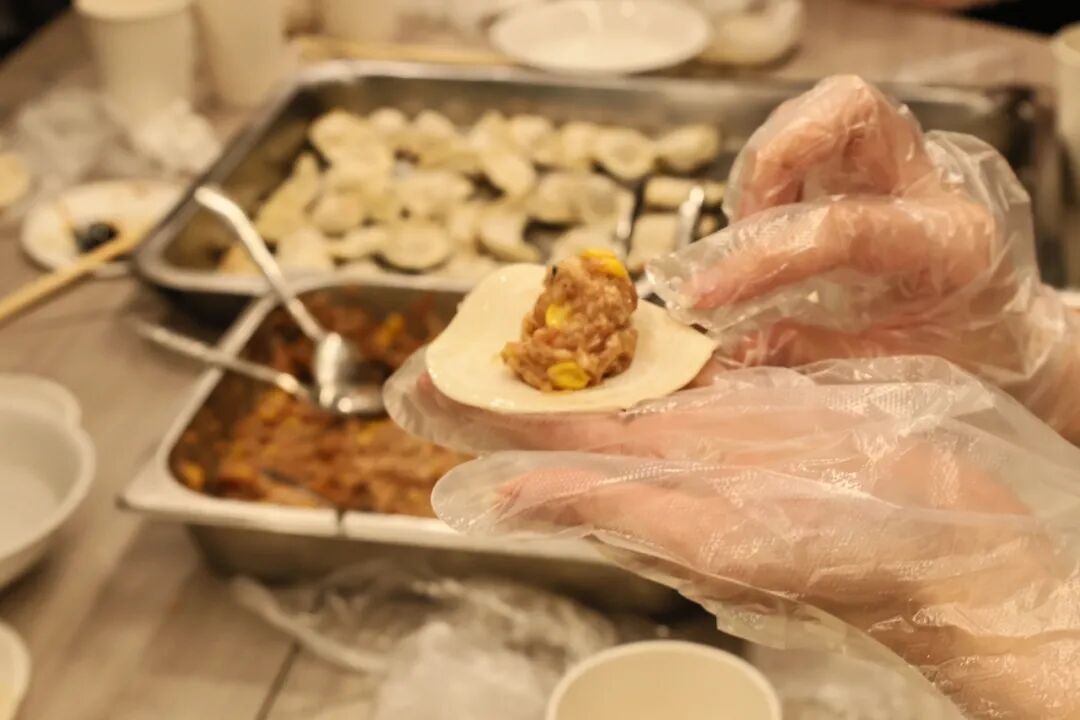 讲解结束后,早已准备好的饺子材料被一一端上桌,现场立刻热闹起来。同学们自发围聚桌边,共同学习饺子的制作。现场氛围热烈又温馨,擅长包饺子的同学主动化身“民间师傅”,手把手传授技艺:取一张饺子皮,在掌心放平,放馅料,讲究“不多不少”,少了则饺子干瘪,多了则难以封口,“老师”们一边示范一边叮嘱,还不忘分享自家包饺子的小诀窍。职工们虽然是第一次包饺子,手法还有些生疏,但是学习劲头十足。他们在“老师们”的指导下认真尝试,一边捏褶塑形,一边交流,时而为一个完美的饺子欢呼,时而为不小心“露馅儿”的失误打趣,并围绕美食背后的文化习俗展开热烈讨论,不同民族与文化隔阂在欢声笑语中悄然消融,指尖的技艺传递与心灵的真诚沟通,让跨文化交融变得具体而温暖。