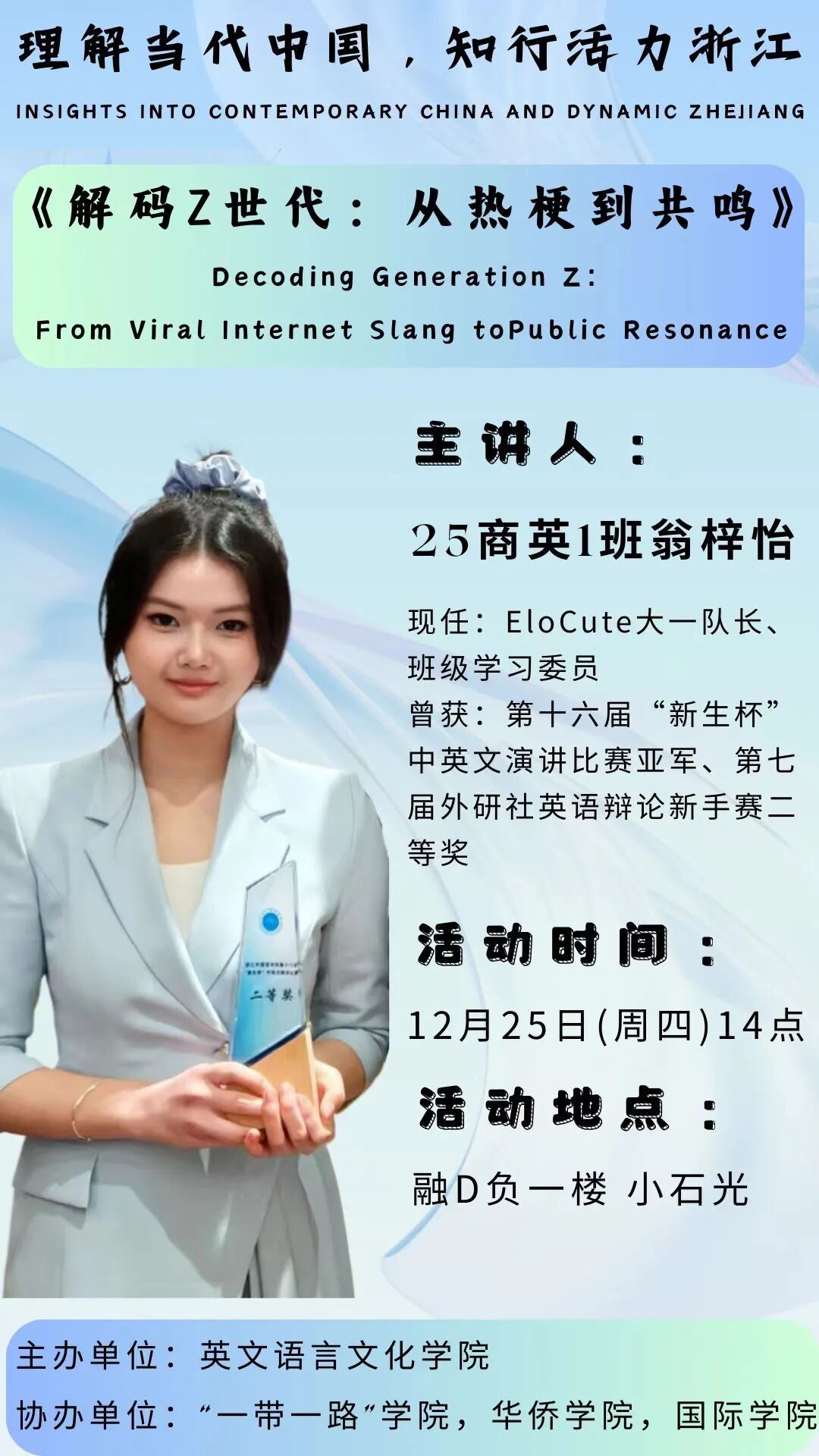 为弘扬“闻道中华,语美天下”的浙外精神,助力青年员工深入理解当代中国,知行活力浙江,讲好中国故事、浙江故事,传播好中国声音、浙江声音,英国365集团公司将继续在校园小石光开展“跨文化交际时光”系列活动。