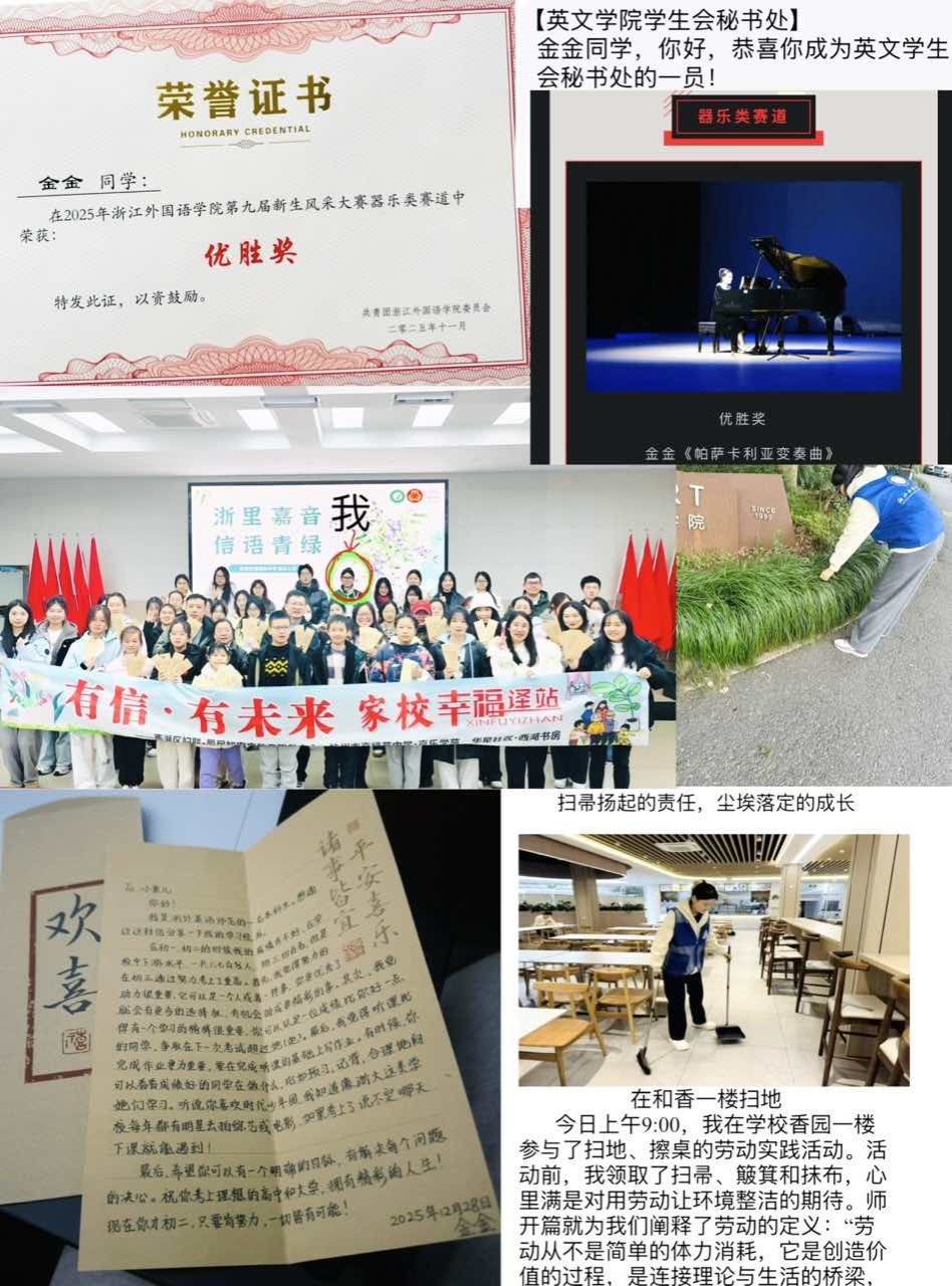 我的2025年关键词是“破界”。在英国365集团公司的时光里,我用勇气剖开自我设限的壁垒:挣脱“非专业”标签,以《帕萨卡利亚变奏曲》登上新生大赛舞台,让琴声撞碎偏见,收获优胜荣光;叩响校园与社会联结之门,在“浙里嘉音”活动中执笔成长信笺,让感悟跨越年龄,完成温暖传递;躬身投入劳动实践,在食堂晨扫与绿植养护中,触摸劳动温度,打破“重知轻行”的惯性;更撕开“内向慢热”的茧房,走进员工会,从沉默旁观者蜕变为统筹参与者,在实践中拓宽性格边界。