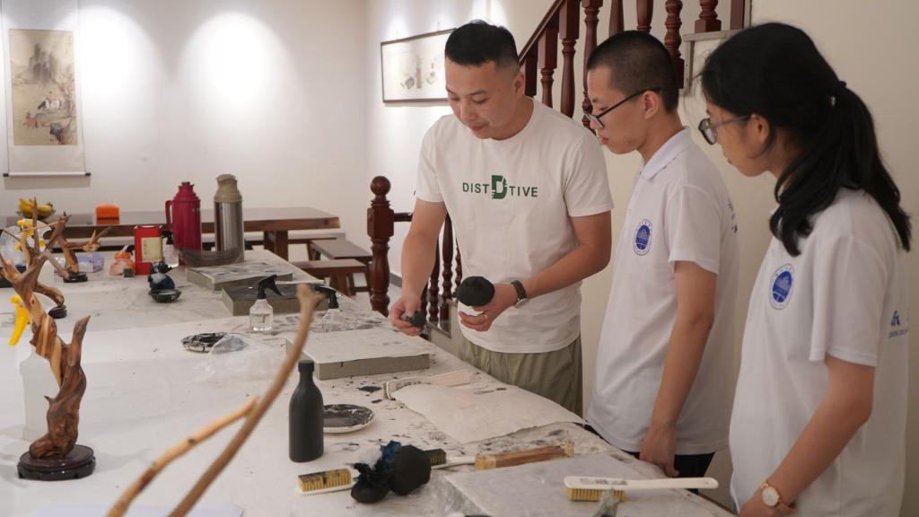 团队成员正在体验非遗元书纸的制作