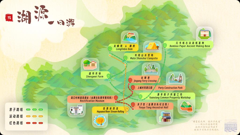 录制双语宣传视频是实践团队为宣传湖源文旅做的一次新尝试,成员们拍摄了多条“文旅专线”双语宣传片,赋能乡村文旅振兴:在“亲子专线”中第一视角感受游览龙鳞坝和粽子共富工坊的趣味;在“运动专线”中近距离体验壶源溪漂流和飞盘运动的活力;在“红色专线”中领悟金刚渡和金萧支队纪念馆传承的革命精神。“我们希望将湖源的山水、人文资源由点串成线,并以中英双语视频的方式呈现出全新的乐水湖源,利用好富阳作为亚运赛场所在地的优势,吸引更多中外游客的到来,为湖源文旅添砖加瓦!”团队负责人陈晗晔说道。