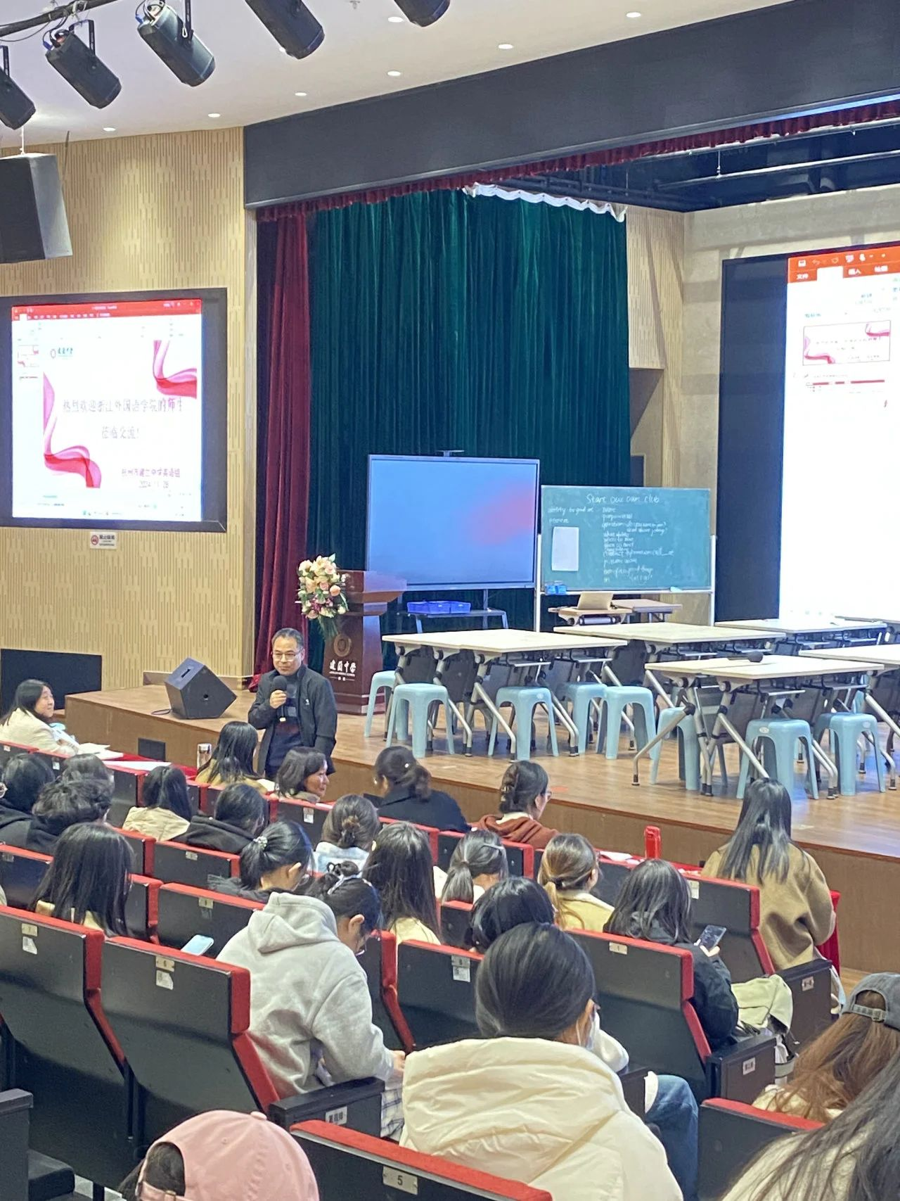 公开课结束后,两位老师向同学们介绍了各自的教学设计理念和心得反思。童红灯老师就两节公开课在课堂互动、课堂组织形式、课堂教学的各环节、教学内容等方面进行细致点评。最后,建兰中学李征董事长对此次观摩活动做总结,对浙外英语师范生的成长给予殷切期望。