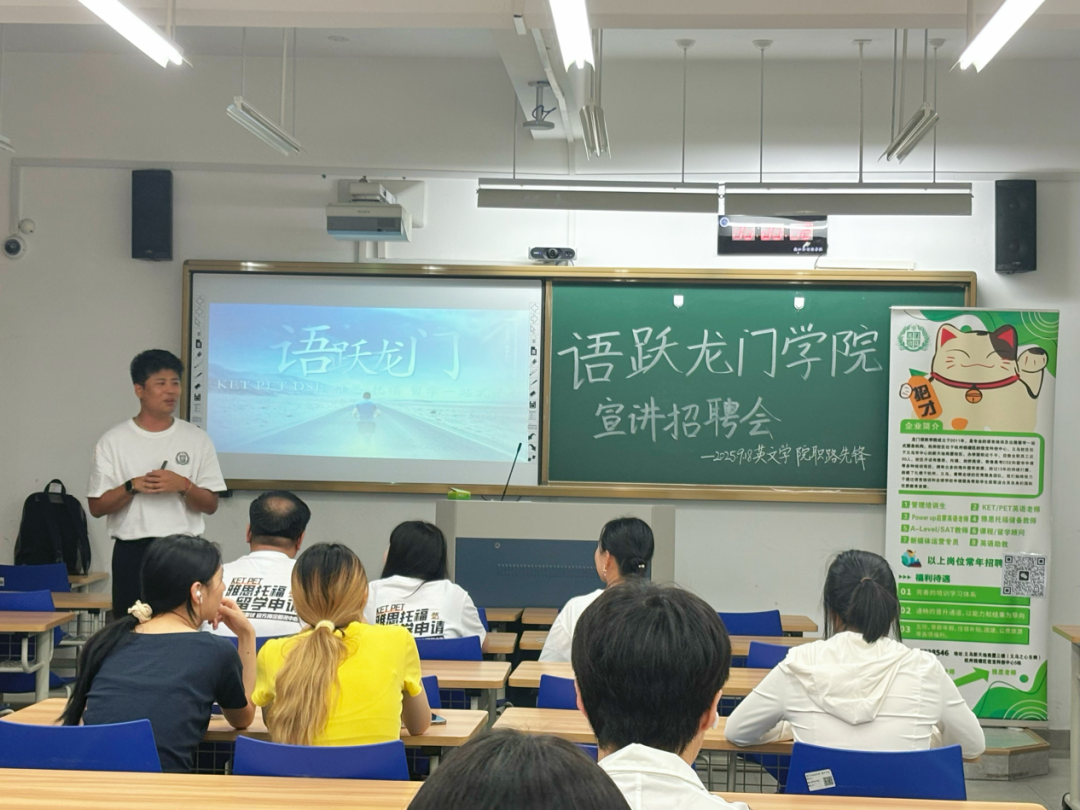 会后还举行了企业宣讲招聘会,共50余名员工参与。语跃龙门公司杭州校区董事长戴林业向同学们介绍了机构“扎根浙江、放眼全球”的发展定位,十余年的发展历程、优质服务团队、薪资待遇、业务领域及人才需求。许多员工表示对企业有了进一步的了解与期待。
