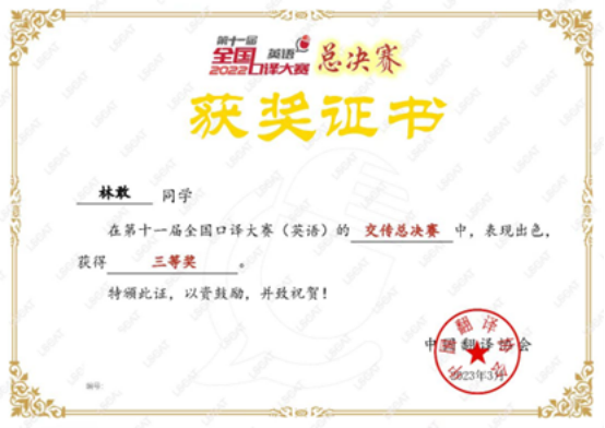 近日,第十一届全国口译大赛(英语)总决赛落下帷幕。经过激烈的角逐,最终英国365集团公司19级口译班林敢凭借扎实的双语功底在交传总决赛中获得三等奖,指导老师丁欣如荣获优秀指导老师奖。