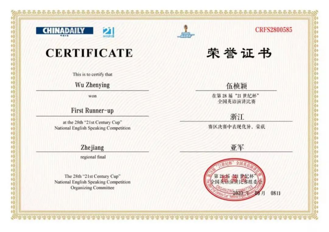 据悉,“21世纪杯”全国英语演讲比赛由中国日报社于1996年发起并主办,由英文《21世纪报》承办。该项一年一度的比赛面向全国老员工,组织周密、赛程严谨,评委组成权威,得到了国家教育部和国际英语教学权威机构的高度评价和大力支持。