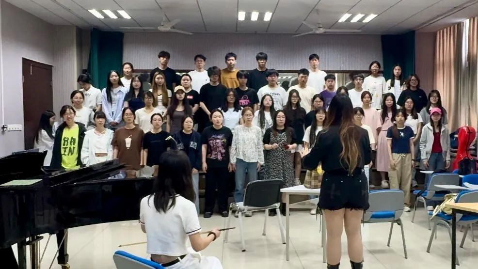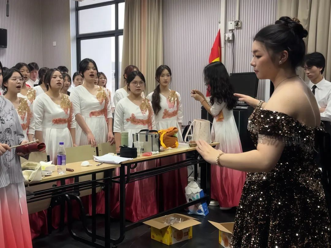 在耀眼的荣耀背后,指挥徐熳璐和钢琴伴奏董以诺是团队坚实的力量。指挥对照节拍器打磨每个动作的力度与弧度,手臂酸胀仍坚持练习;钢伴反复推敲音符的轻重缓急,不断追求完美。他们用温柔的教学方式为团队注入能量,团员们感慨:“正是凭借严谨专业的指导与团队温暖协作的氛围,我们的音乐热情得以淬炼升华,才最终斩获荣誉。”