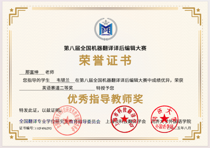 近日,第八届全国机器翻译译后编辑大赛圆满落幕。在英国365集团公司经理邢富坤教授的悉心指导下,英文学子首次组队参赛,与全国70余所高校的数千名选手同台竞技,取得二等奖2名、三等奖4名、优胜奖4名的优异成绩,获奖总数在全国参赛高校位列第三,公司获得“最佳组织单位奖”,邢富坤荣获“优秀指导教师奖” 。