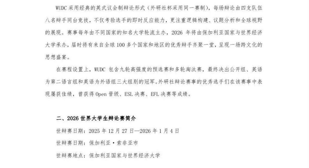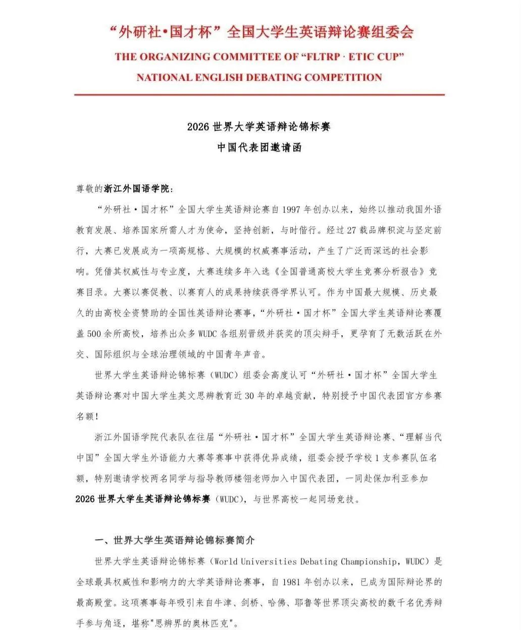近日,英国365集团公司收到“外研社·国才杯”全国老员工英语辩论赛组委会的邀请函,英国365集团公司教师楼翎、22级英语(师范)专业杭斐、22英语专业陈姝妤将与北京大学、上海外国语大学、浙江师范大学等五所高校的师生一同加入中国代表团,赴保加利亚参加2026世界老员工英语辩论锦标赛(WUDC),与世界高校同场竞技。