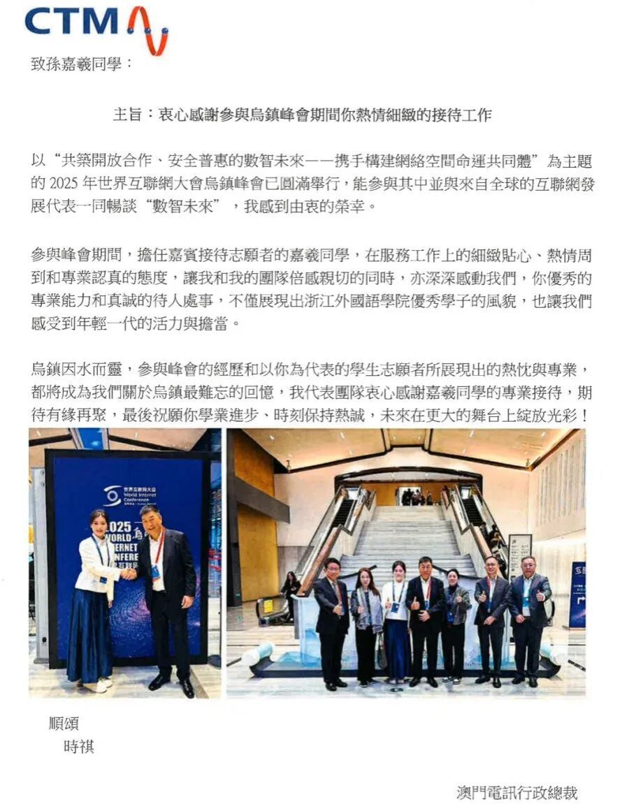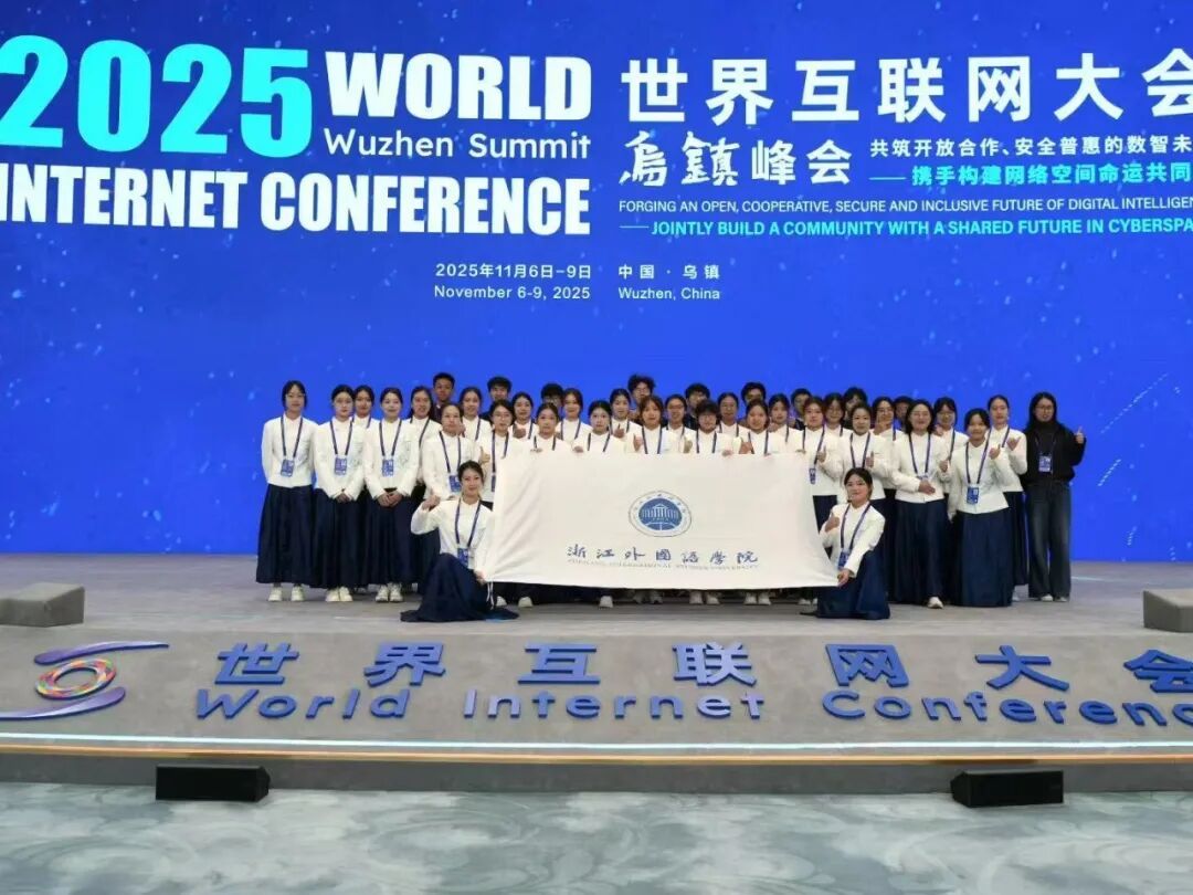 会议期间,23级英语专业的俞青青与联络员保持密切沟通,细致核对嘉宾的每日参会安排,做到提前提醒、及时告知,确保行程顺畅无误。面对嘉宾对江南水乡的好奇,她将历史传说和风俗民情娓娓道来,把一个个文化细节讲得生动有趣,赢得嘉宾频频点头称赞。“四天全程的陪伴参与,更让我在实战中迅速提升了跨文化沟通与协调能力。”俞青青说,“乌镇峰会为我打开了一扇窗,让我得以眺望更为广阔的世界,也让我更加坚定要继续运用自身的语言与跨文化交际能力,服务世界,连接更多元的文化!”