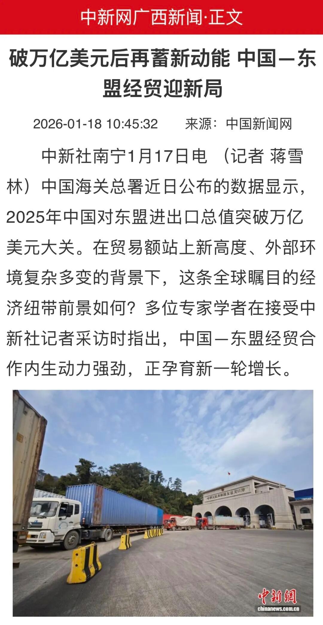 中新社南宁1月17日电 (记者 蒋雪林)中国海关总署近日公布的数据显示,2025年中国对东盟进出口总值突破万亿美元大关。在贸易额站上新高度、外部环境复杂多变的背景下,这条全球瞩目的经济纽带前景如何?多位专家学者在接受中新社记者采访时指出,中国—东盟经贸合作内生动力强劲,正孕育新一轮增长。