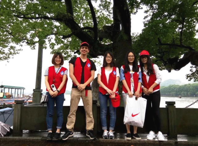 同学们身穿红色志愿者服,在西湖边捡拾垃圾,倡导绿色出行,进行道路引导,接受游人咨询,为来自国内外游客提供帮助。在烟雨朦胧的西湖,红色的志愿者服成了一道别样的风景线。