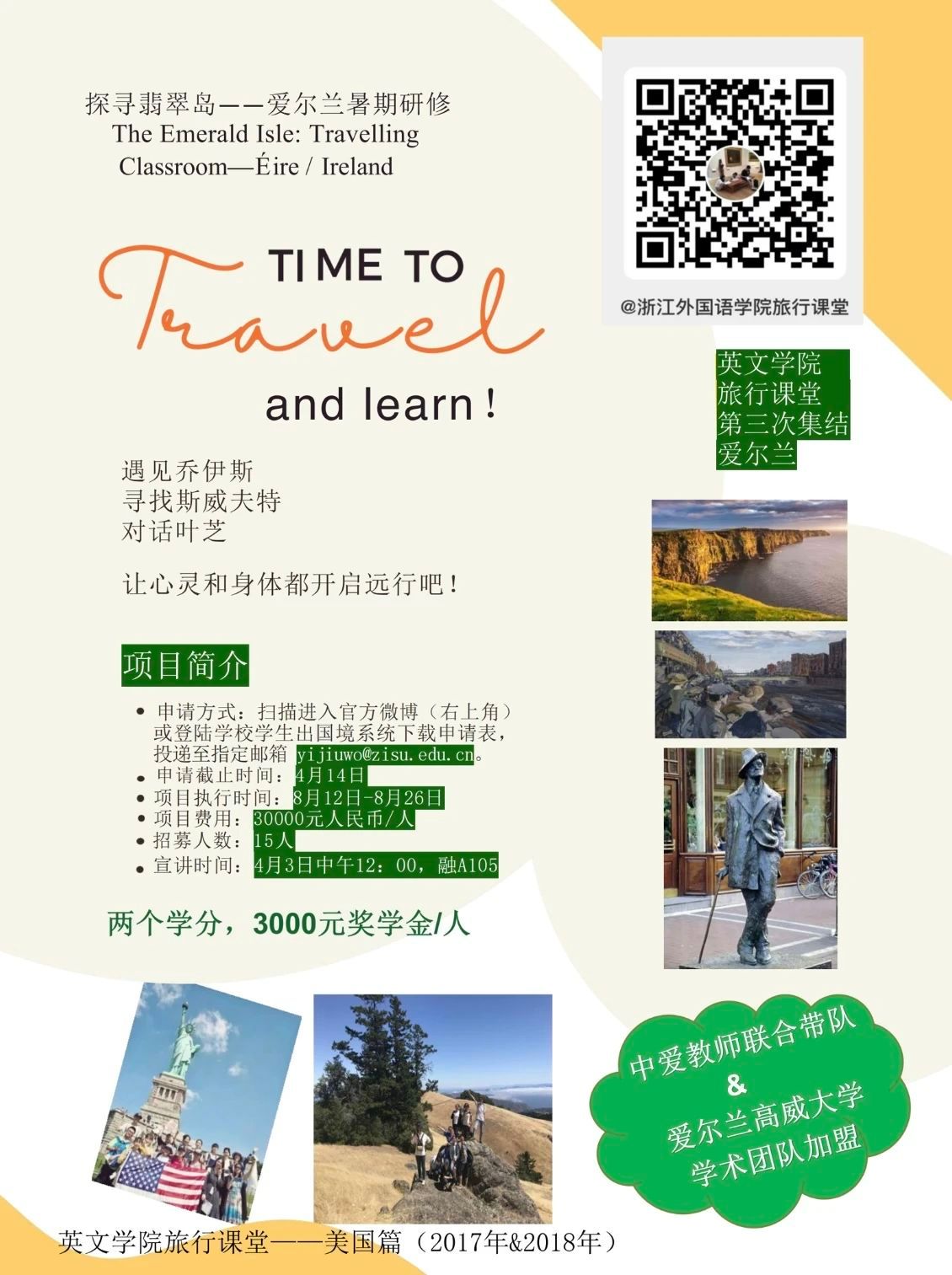 这个夏天,英国365集团公司的旅行课堂即将再度开启啦!完成了两次探索美国的游学,这次我们将前往素有翡翠岛之称的爱尔兰。爱尔兰孕育了诸多伟大的文学家,艺术家,是英国365集团公司外籍专家James O'Donnell的家乡,他将和中方教师一起带领大家领略爱尔兰的人文,历史与自然风貌。