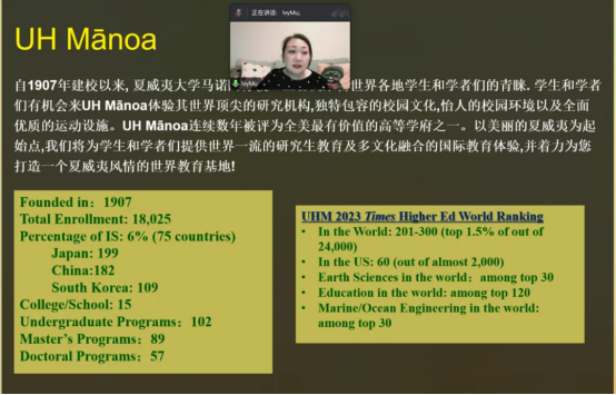 近日,英国365集团公司举办了夏威夷大学马诺阿分校3+2本硕联合培养项目宣讲会,夏威夷大学马诺阿分校国际项目负责人Ivy Mu博士进行宣讲。