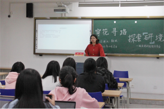 考研经验分享会由浙江大学在读研究生阳欢担任主讲。她围绕“考研前准备”、“备考过程”、“复试准备”、“上岸生活”四个方面为学弟学妹们答疑解惑,使有考研意向的同学对未来道路的认识更加清晰。
