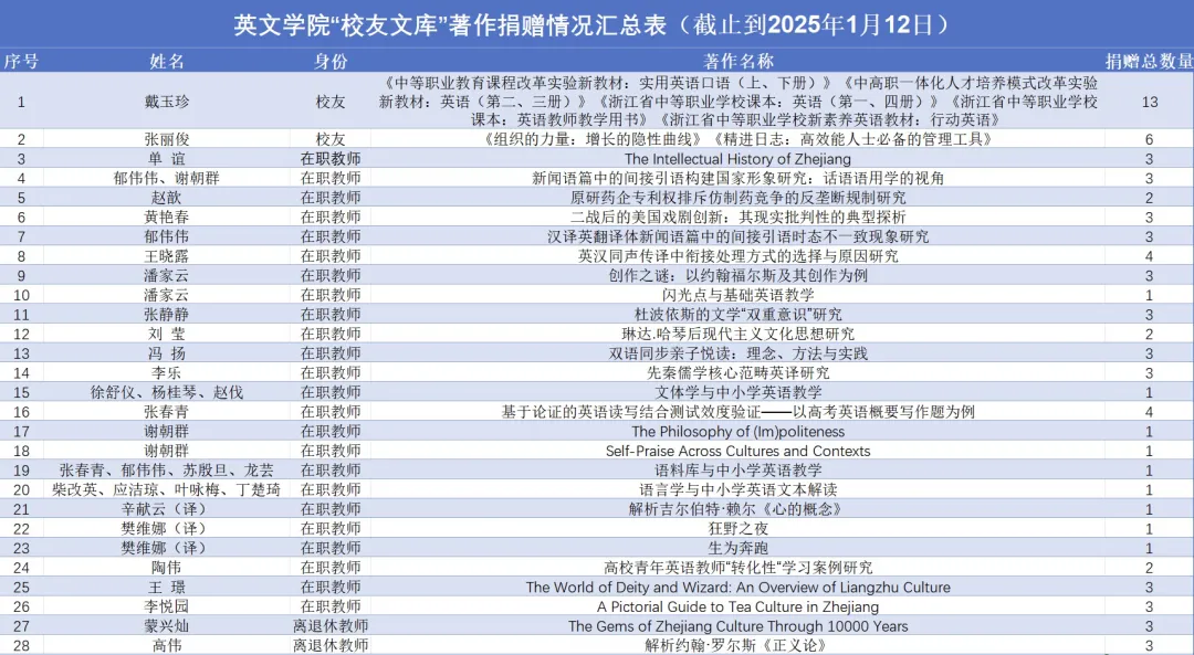 我们在此向所有为“员工文库”慷慨捐赠的员工与教师们致以由衷的感谢,并诚挚邀请更多员工与教师们加入到捐赠的行列中,以进一步弘学术精神,延续浙外文脉,彰显前贤,激励后学。