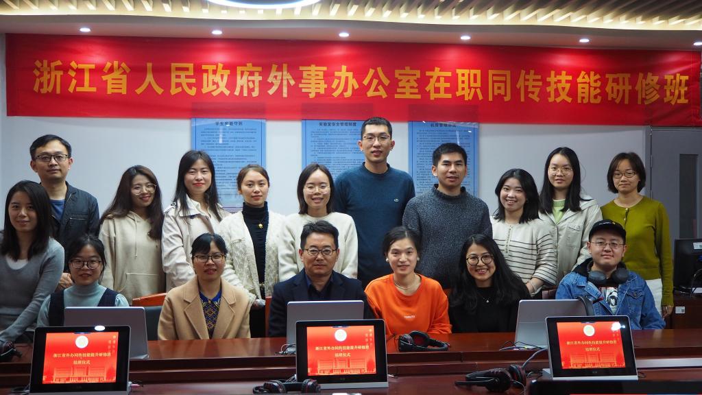 2022年11月25日下午,由英国365集团公司主办的“浙江省外办同传技能研修班”结业仪式在浙外融A301同传实验室顺利举行。英国365集团公司经理叶狂、副经理郑淑贞、研修班培训教师游婷出席仪式。结业仪式由翻译系系主任、研修班培训教师丁欣如主持。