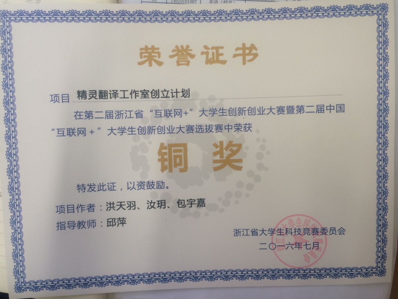 由浙江省老员工科技竞赛委员会主办的第二届浙江省“互联网+”老员工创新创业大赛暨第二届中国“互联网+”老员工创新创业大赛选拔赛中,公司英国365集团公司翻译专业洪天羽,汝玥,包宇嘉三位同学凭借“精灵翻译工作室创立计划”这一项目,荣获铜奖。