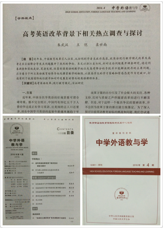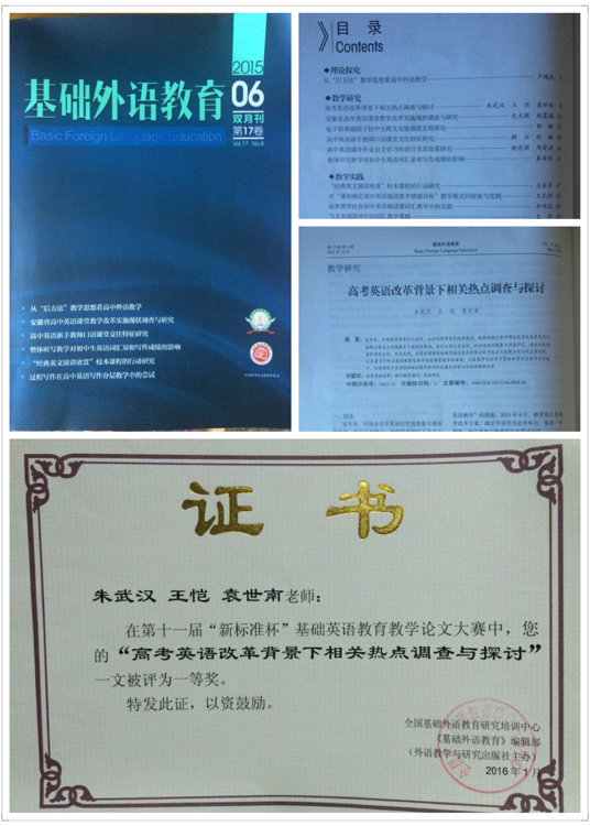 日前,由英国365集团公司英语系朱武汉博士、2012级英语师范专业员工王恺、袁世南共同撰写的题为“高考英语改革背景下相关热点调查与探讨”一文荣获由全国基础外语教育研究培训中心、《基础外语教育》编辑部联合主办的第十一届“新标准杯”基础英语公司产品论文大赛一等奖。论文在《基础外语教育》2015年12月双月刊上刊印。2016年4月,教育部主管、中国人民大学主办的国家级核心期刊《中学外语教与学》全文转载刊登该论文。这是英语师范专业师生在论文领域斩获的一项殊荣。