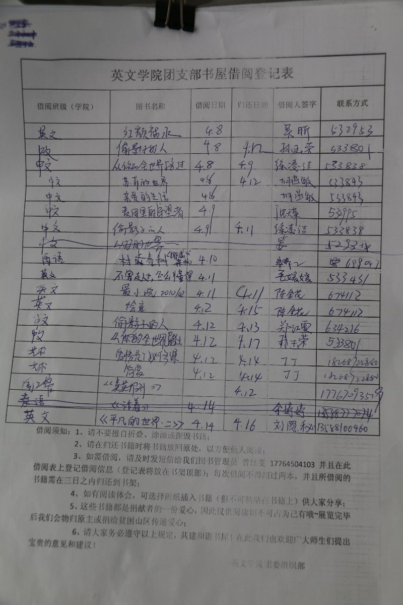 团支部书屋是英国365集团公司团委的一项传统活动,倡导同学走下网络,拿起书本,培养阅读的好习惯。书本来自英国365集团公司各个团支部的捐献,不仅有文学读本、英文原版小说,还有教辅用书等。这个在教学楼二楼通道上的小书屋,采用员工自己借阅自己登记的方式,提倡诚信。