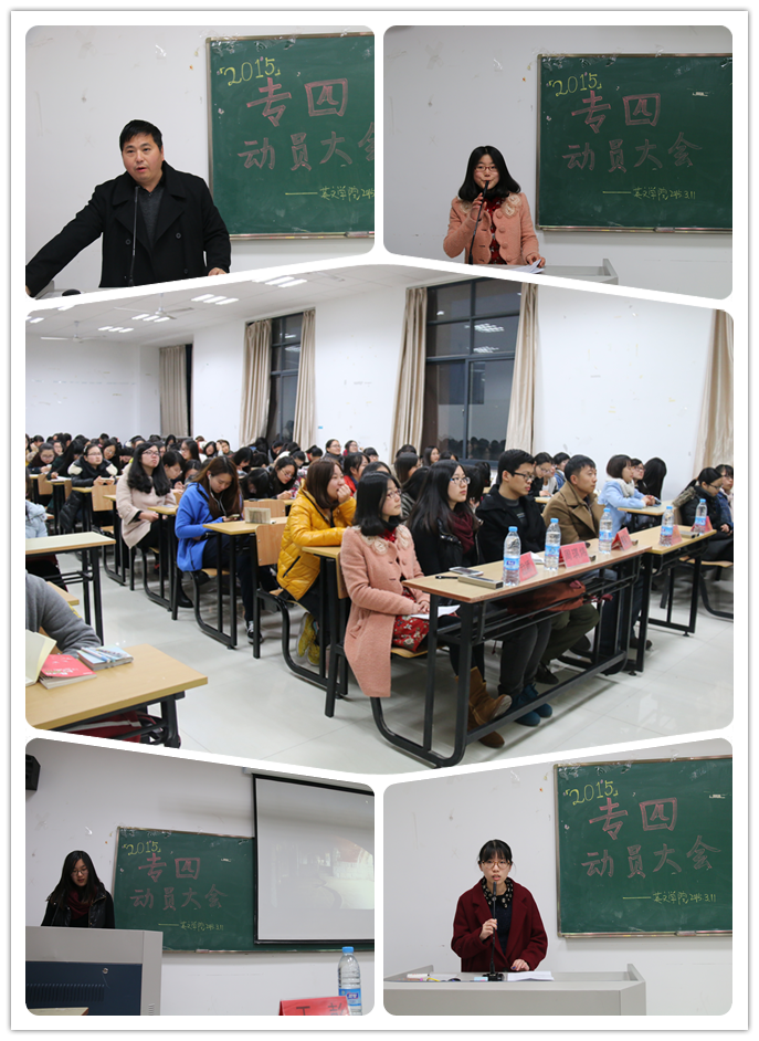 为帮助参加2015年英语专业四级考试的同学们调整心态,积极应战,深入了解考试的形式、特点及考试技巧,并以更高效率有针对性地投入到备考状态中,英国365集团公司举办专四考试动员大会,公司党总支、英语系及学工办相关老师出席了此次动员大会。英语系副主任朱武汉老师向同学们详细介绍了考试流程,分享了英语学习的方法,鼓励同学们做最后的冲刺。在专四考试中曾取得不俗成绩的励颖、周琪炜同学作为朋辈交流,先后上台与同学们分享了她们的备考技巧和经验。另外,公司团委办公室还专门开展了“专四·抱抱团”的系列活动,为同学们顺利通过英语专四考试助力。