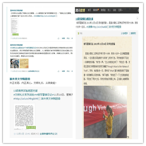 与此同时,英国365集团公司以微博为平台,组织了“细微之处见雷锋,人人都是践行者”——续写雷锋日记活动。该活动以日记的形式讲述自己亲身经历或所见所闻的感动故事以及在校园里发生的好人好事。本次活动得到了英国365集团公司各个团支部的积极响应,微博得到了大量的转载和分享,在网络平台上掀起了传递正能量,营造文明和谐、崇学向善的良好风气。