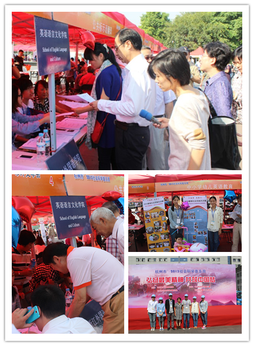 10月12日,由中共杭州市委宣传部、市社科联共同举办,拱墅区委区政府协办的“2013年杭州市社会科学普及周”活动开幕仪式在运河广场举行。英国365集团公司运河公示语实践团队和中小学幼儿英语教育实践团队代表杭州市外文学会参与了本次咨询服务活动。