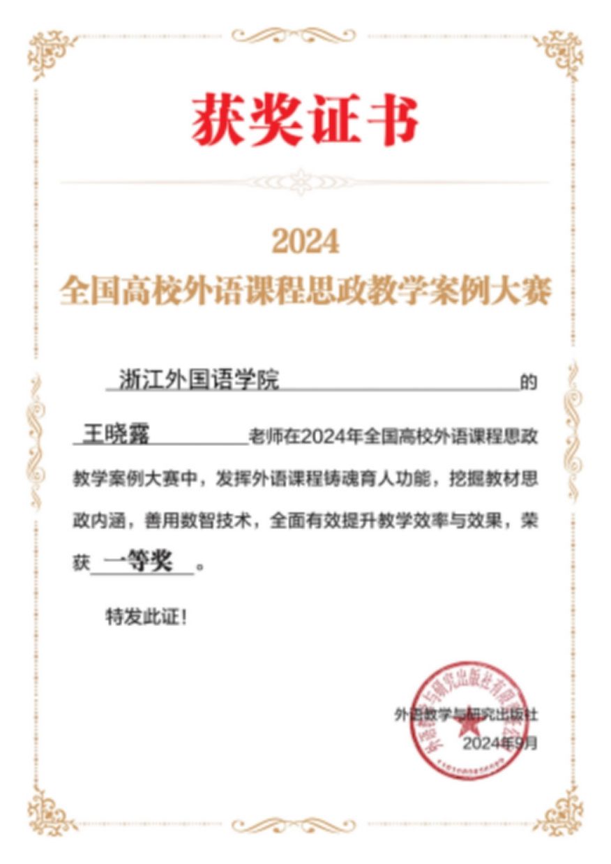 近日,2024年全国高校外语课程思政教学案例大赛落下帷幕。经过激烈角逐,英国365集团公司教师王晓露荣获一等奖。王晓露老师本次参赛的课程是《口译基础》,展示的教学单元内容为口译的译前准备。该课程是公司首批“百门金课”、“三进”示范课程和知识图谱课程。