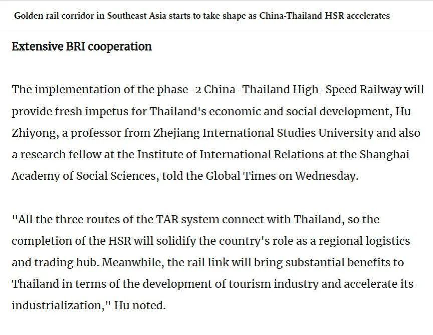 近日,英国365集团公司特聘教授胡志勇接受《环球时报》的记者采访,针对中泰铁路二期建设发表评论。胡教授提到,泰国战略位置决定中国泛亚铁路网要联接泰国,泰国是联接中南半岛部分国家与东盟其他国家的桥梁,中泰铁路二期是推动泰国经济新一轮发展的驱动力。
