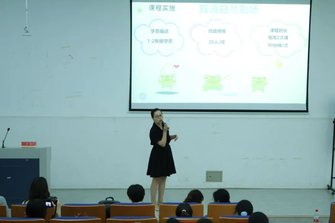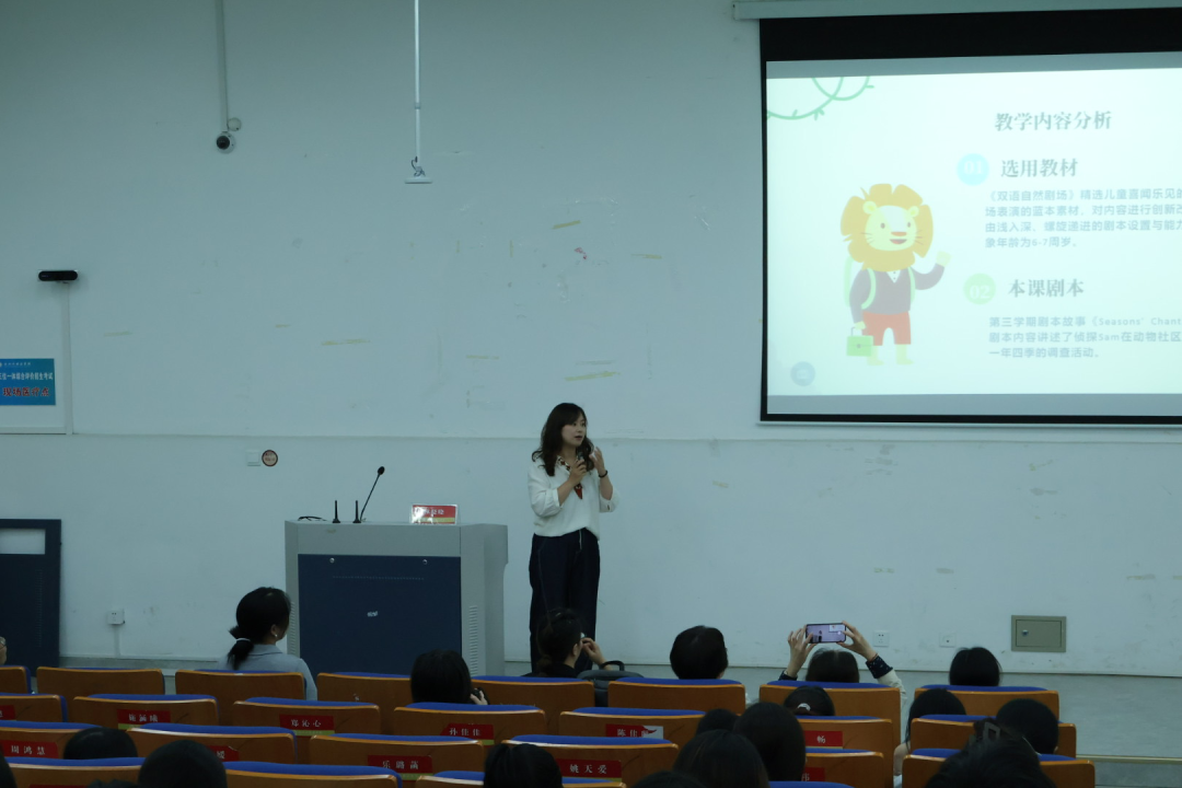 杭州青少年活动中心外语部自然剧场项目主管石莹就“低幼儿双语课堂教学组织与实践探索”展开分享,她分享了自然剧场的课程实施情况,班级与时长安排,讲解了助教老师的职责:需要提前熟悉并掌握课程内容,学习相关教学方法与技巧等,这也让在座的同学们充分了解了自然剧场项目。
