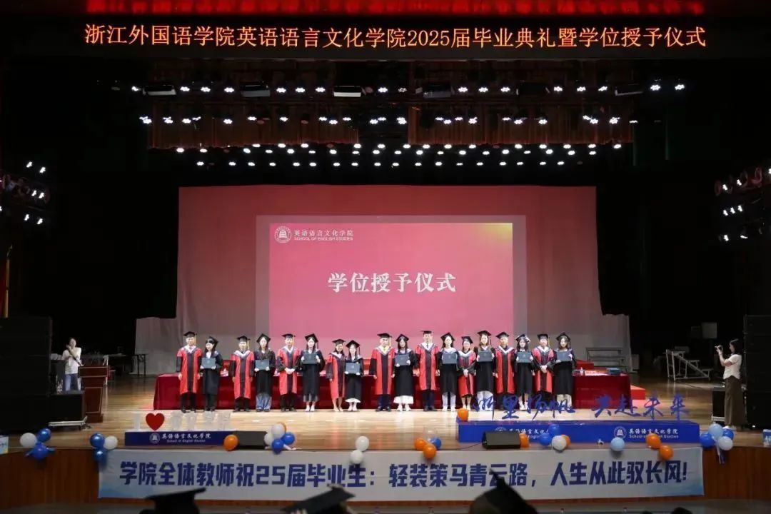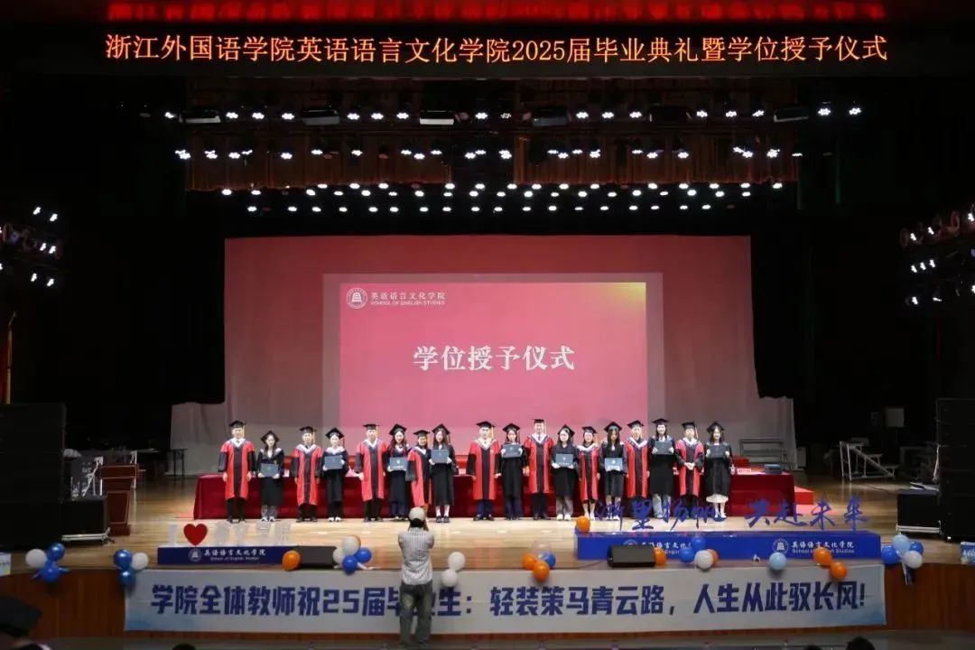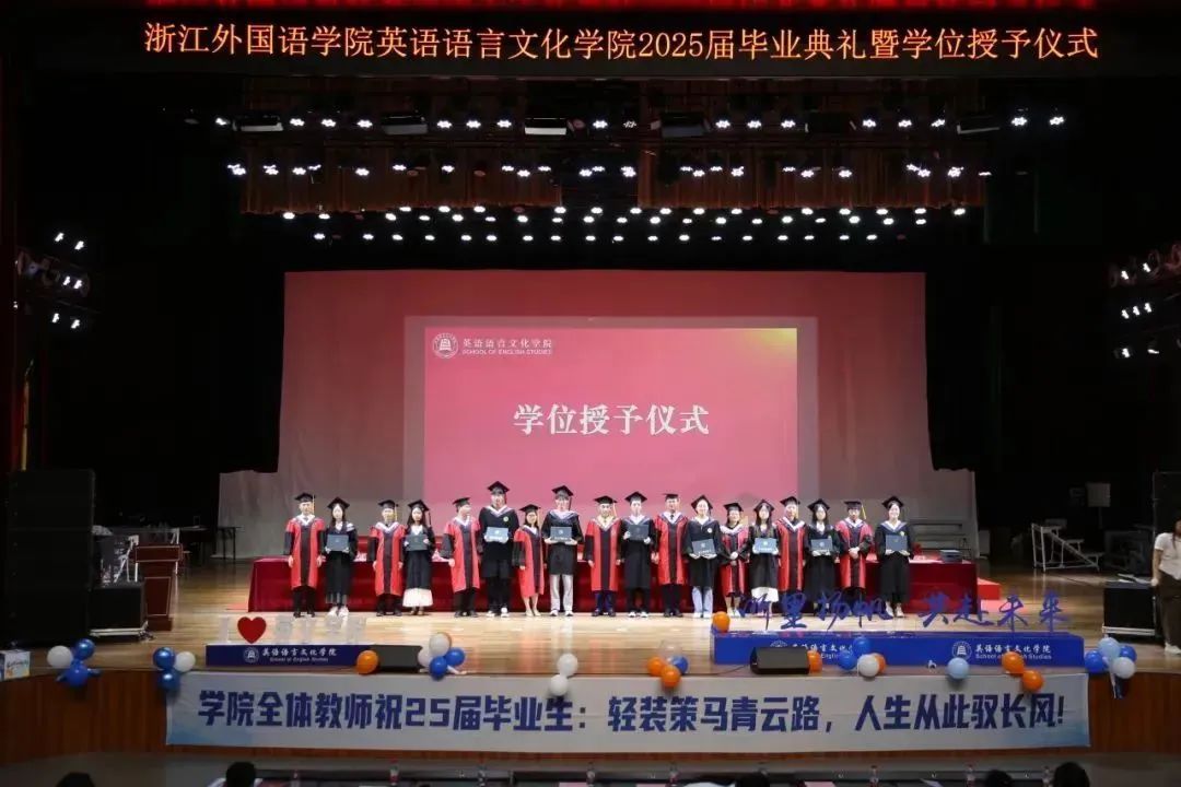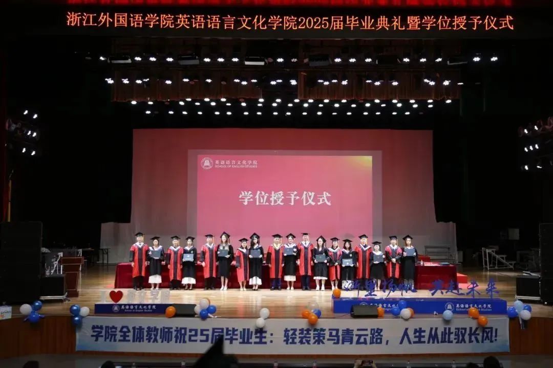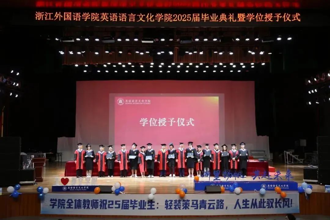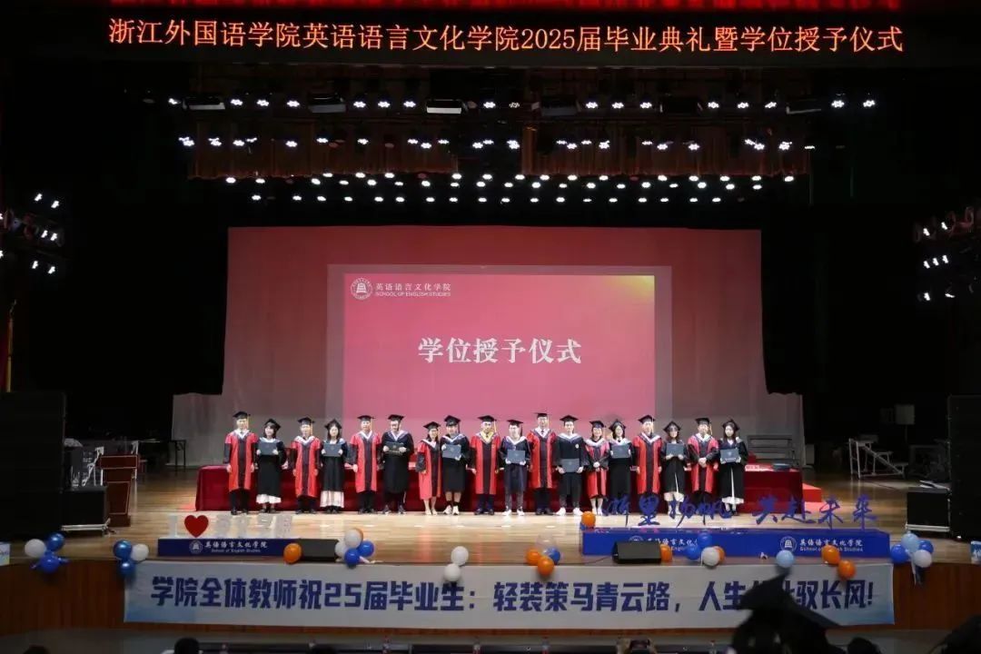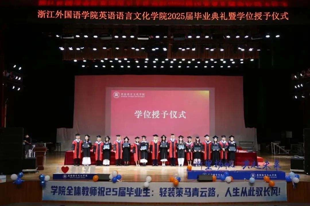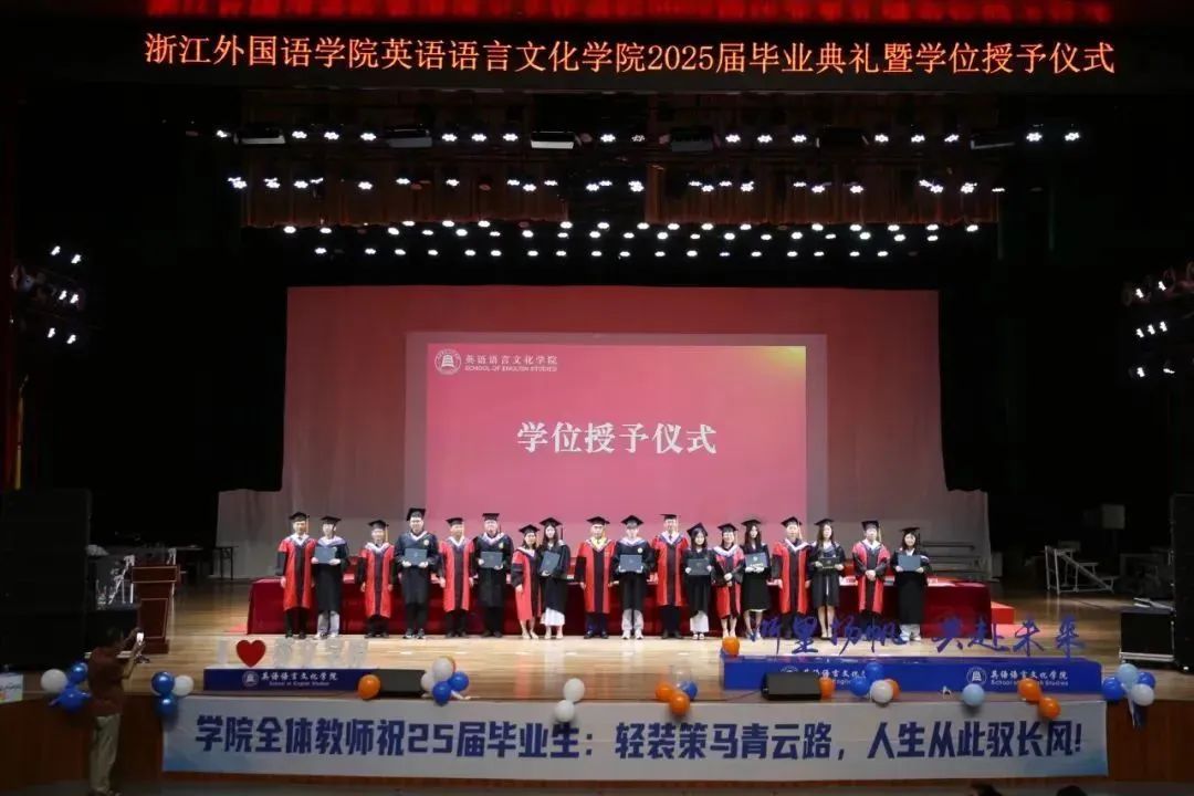 毕业生代表、2025届英语(师范)专业的胡馨宇带领大家一起回忆了在校期间诸多难忘而珍贵的瞬间,呼吁毕业生始终铭记校训院训,牢记浙外英文人的身份,不负韶华,继续前行。