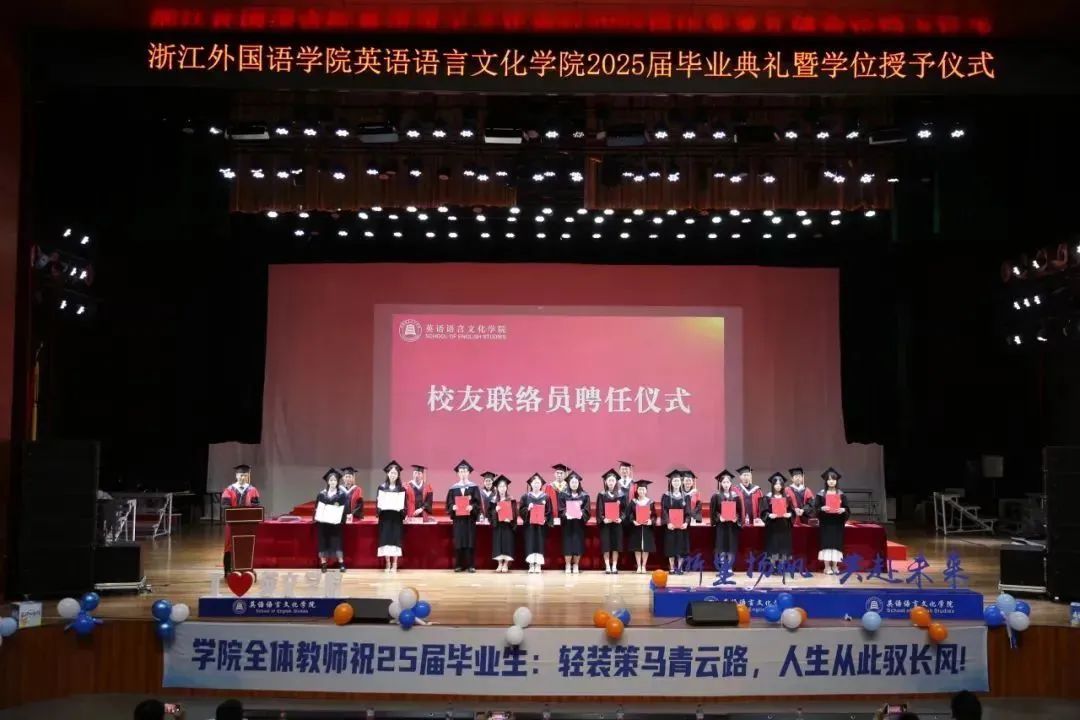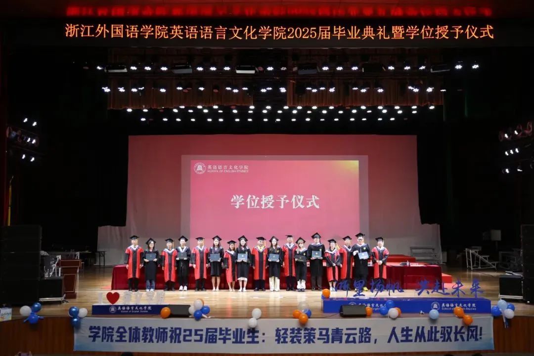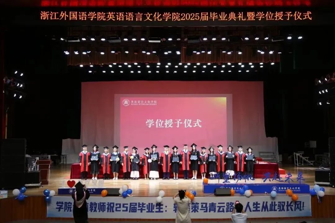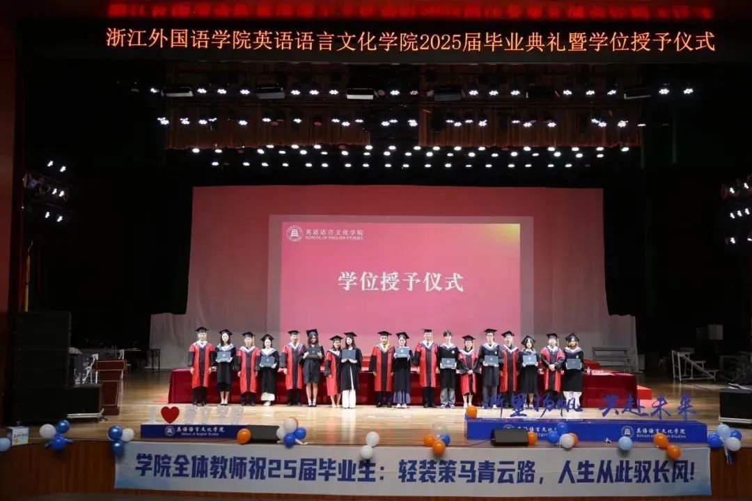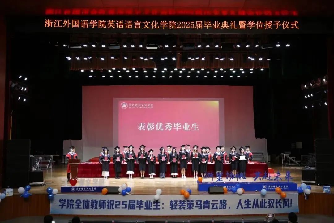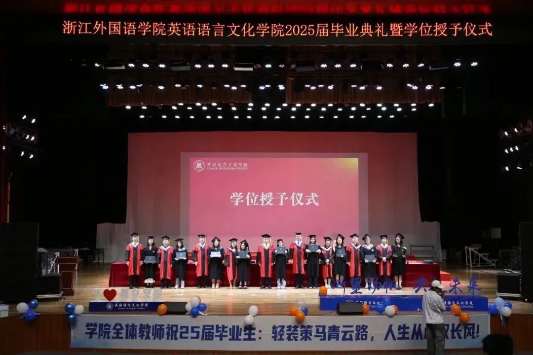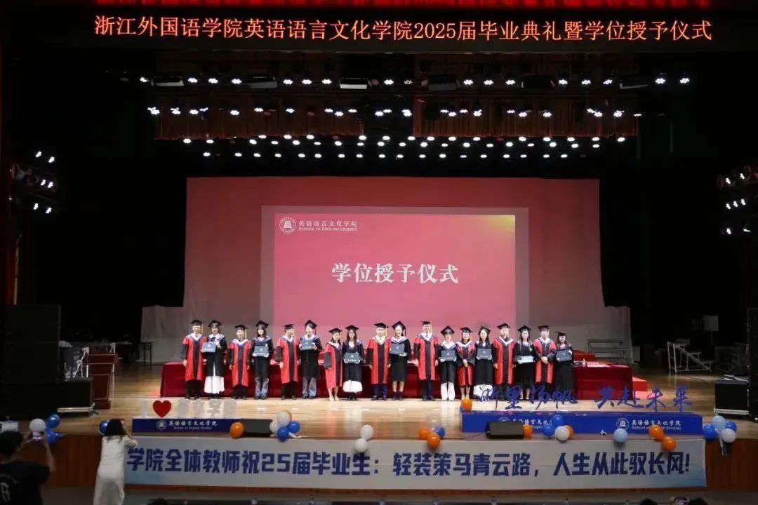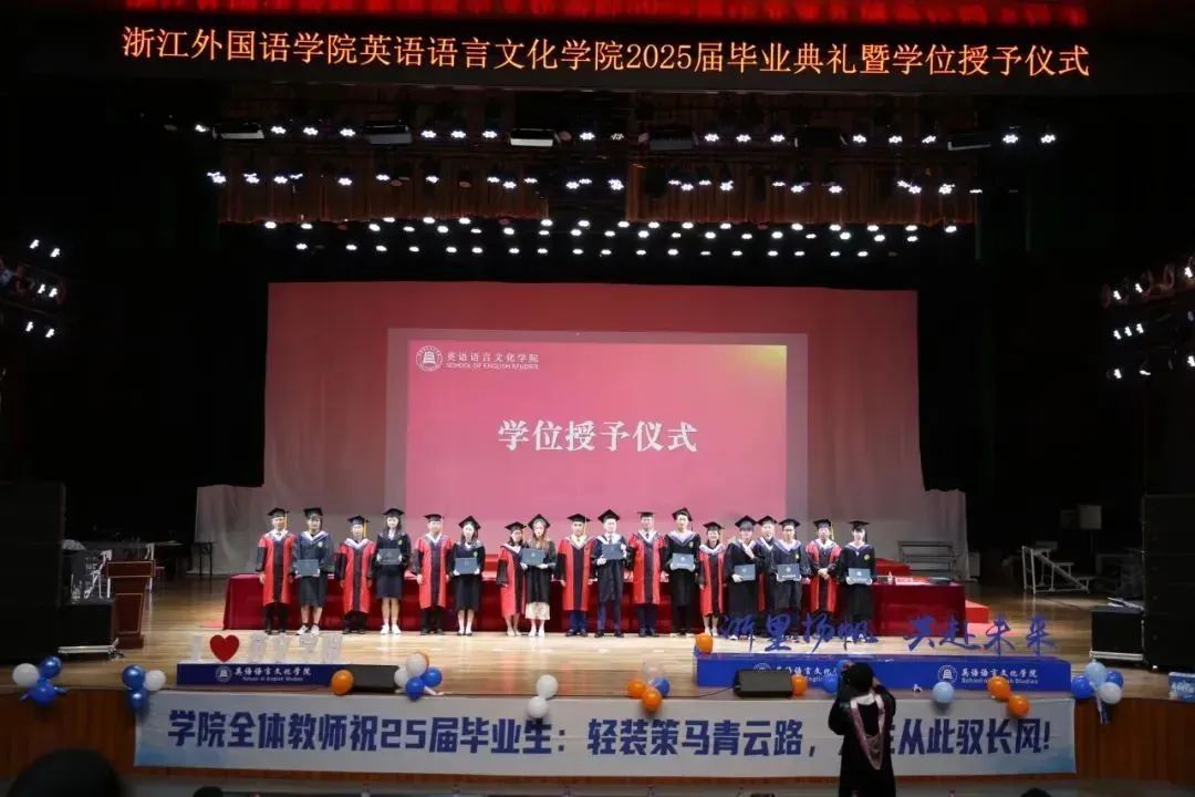毕业生代表、2025届英语(师范)专业的胡馨宇带领大家一起回忆了在校期间诸多难忘而珍贵的瞬间,呼吁毕业生始终铭记校训院训,牢记浙外英文人的身份,不负韶华,继续前行。