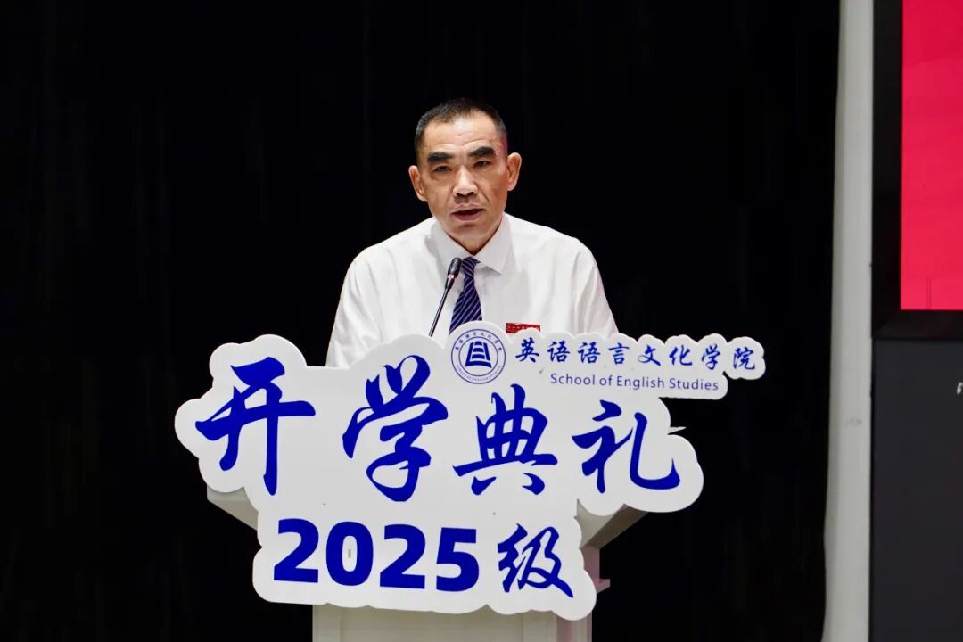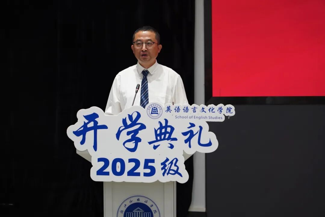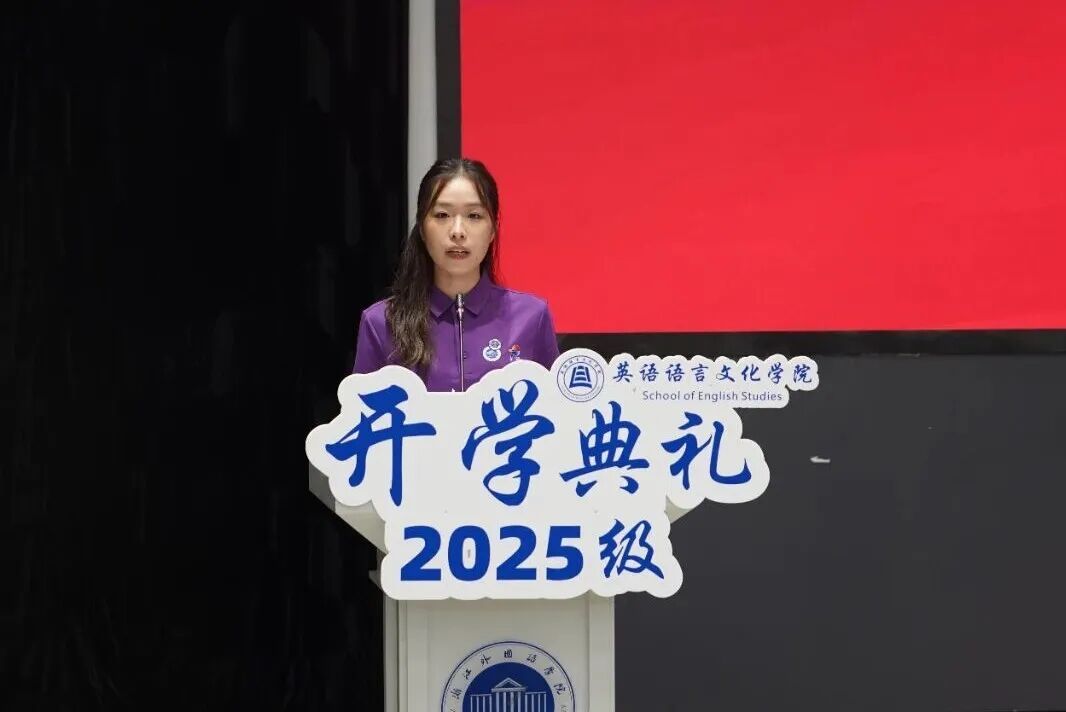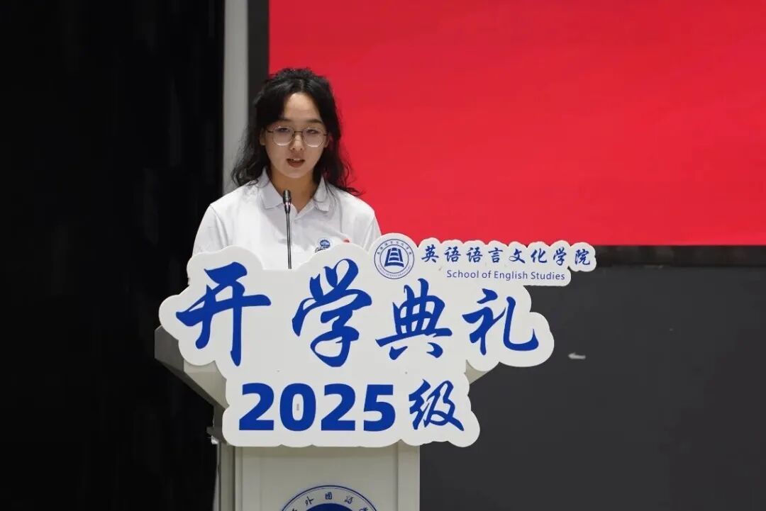 2025级英语5班吴佳童同学作为本科新生代表发言。她号召全体新生以“明德弘毅,博雅通达”的校训为指引,深耕专业、胸怀世界,用青春与拼搏讲好中国故事,用汗水与智慧书写精彩篇章。